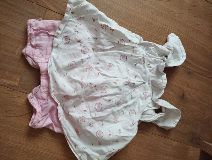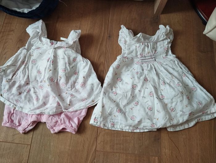 Une combi short et une robe de la même collection Détails dorés dans le tissus Lavées mais jamais portées Parfait état 1x = 3 euros Le lot pour 5. #bébéfille6moisetoile67100