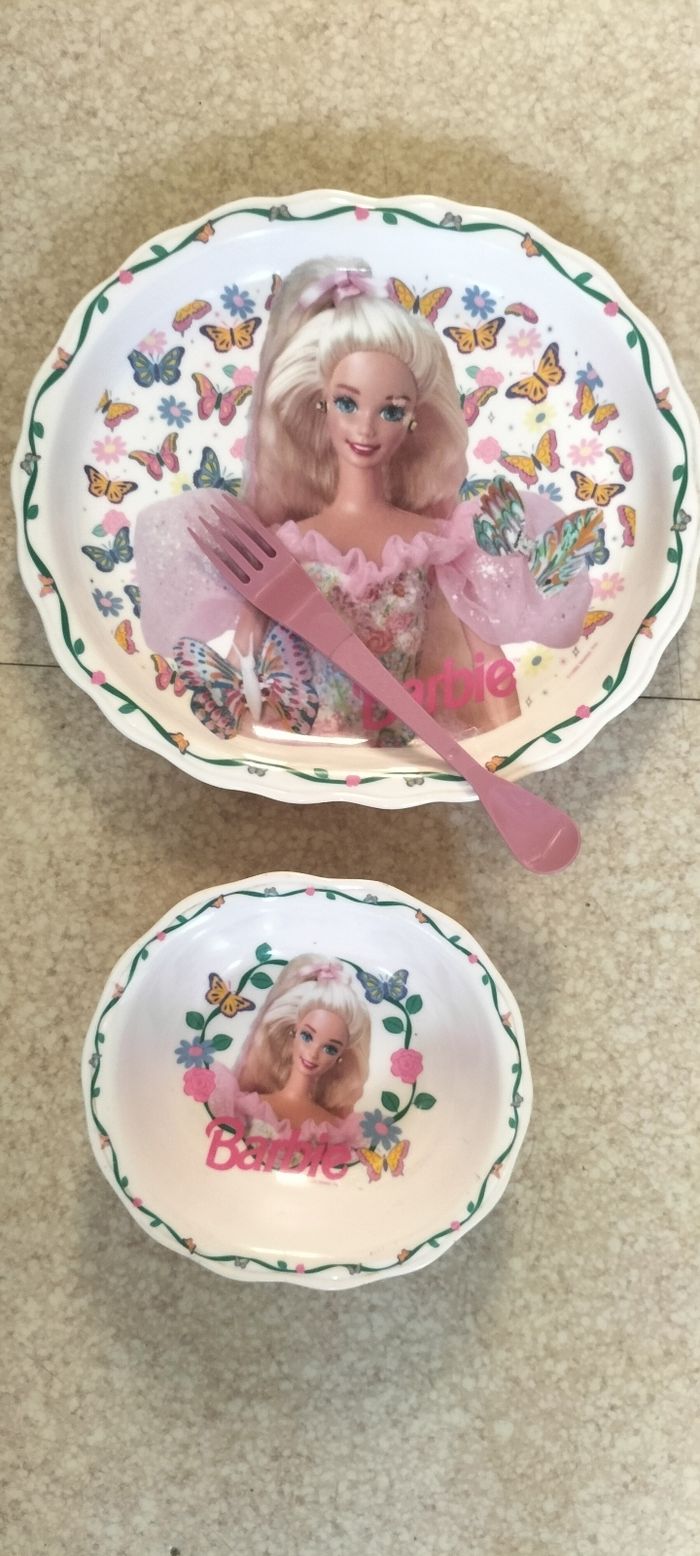 Lot repas barbie 3 pieces Un peu abîmé au niveau de l'oeil rien de grave , encore en bon état Marque zak designs 5€