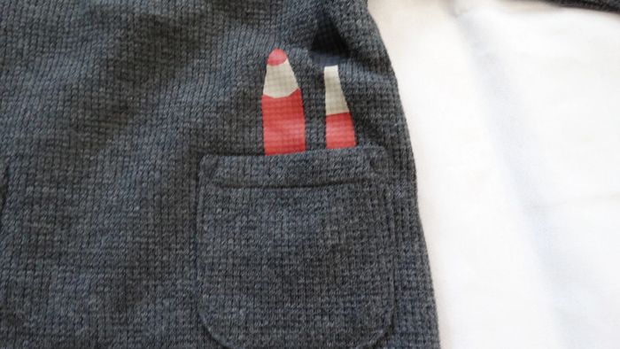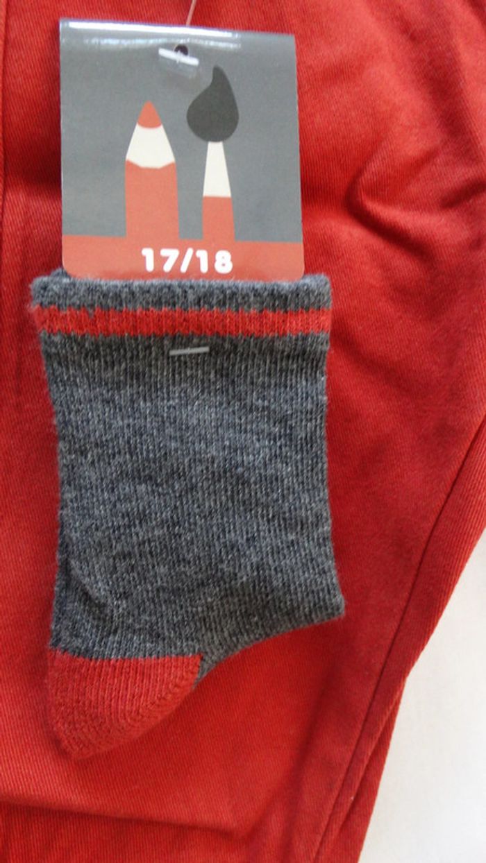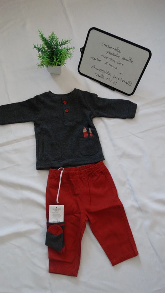 Ensemble pantalon rouille à élastique Taille 6 mois Tee shirt gris foncé col en rond petits boutons rouge 2 poches motifs crayons Taille 6 mois 1 Paires de chaussettes gris foncé et rouille Taille 17/18