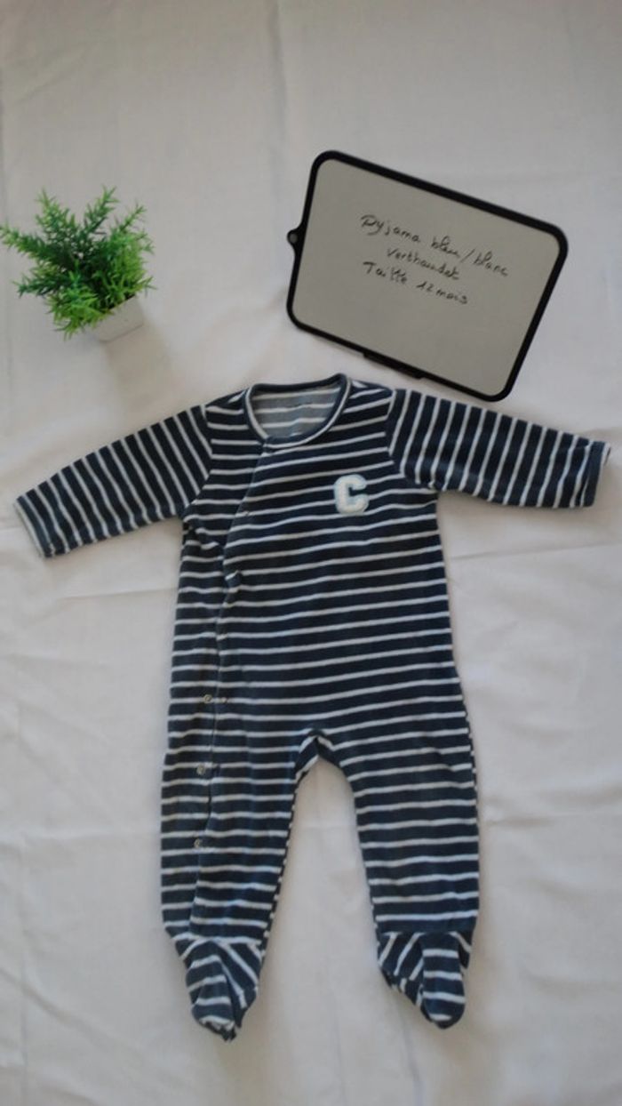Pyjama rayé bleu/blanc Motif C en blanc Col en rond Fermeture à pression sur le coté Vertbaudet Taille 12 mois