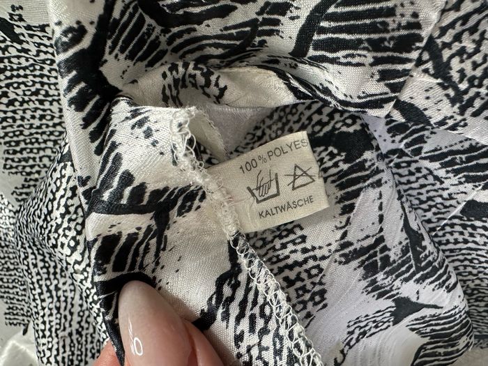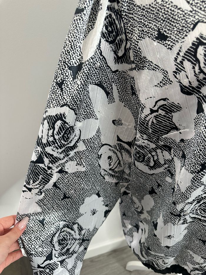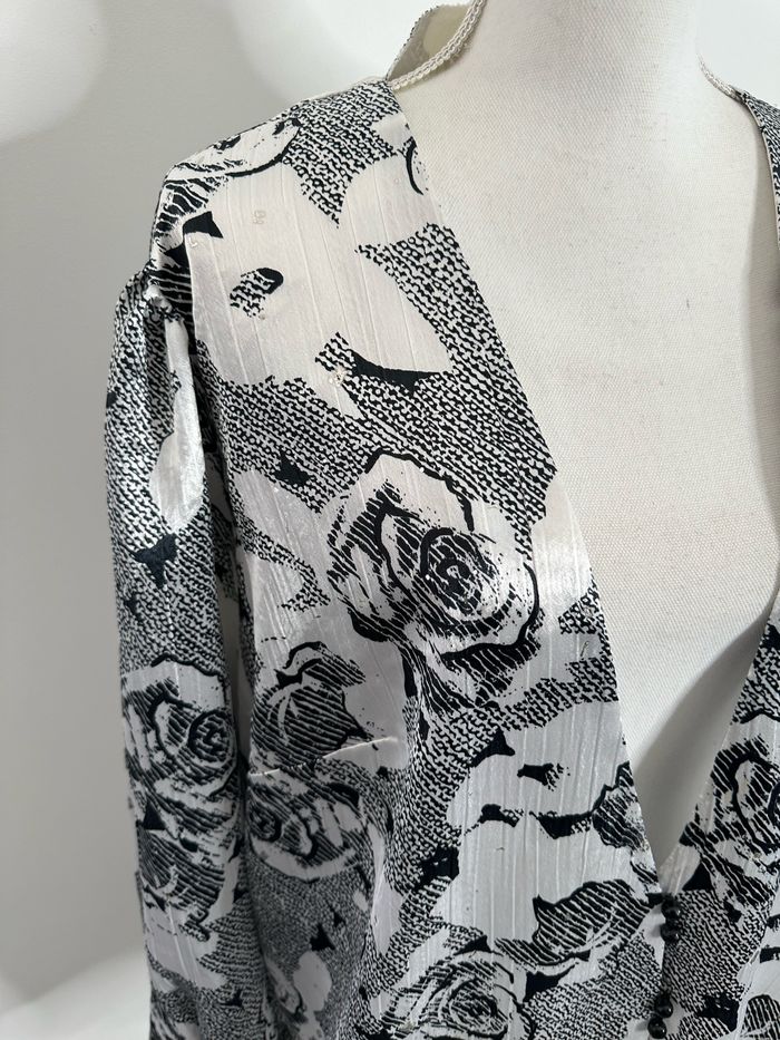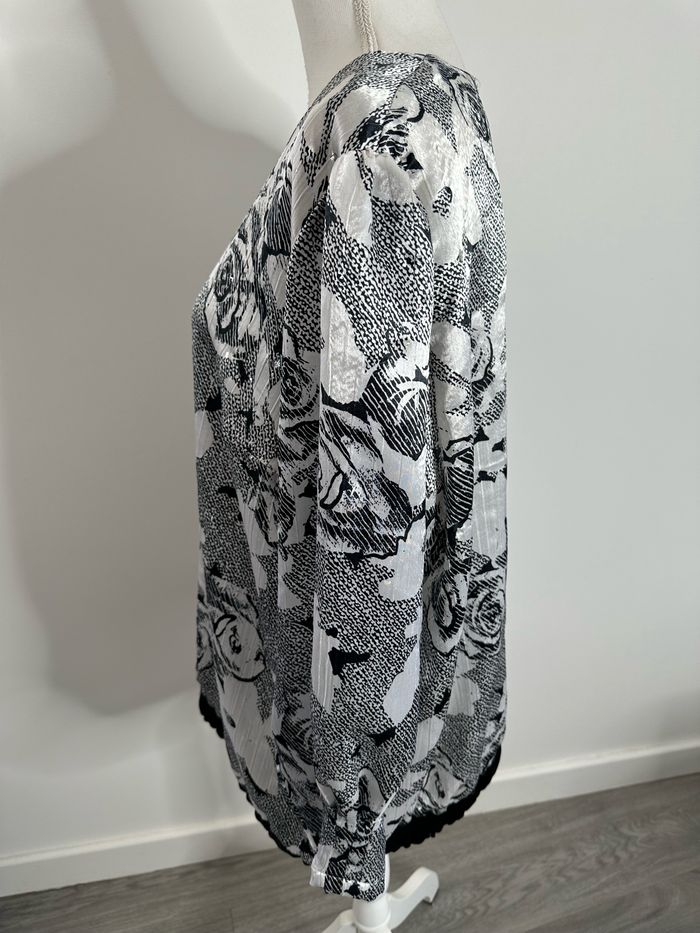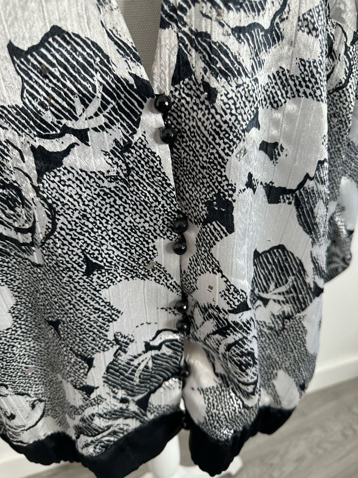 Blouse oversize satinée - Excellent état - Taille 44 équivalent XXL - Blanche, Noire et argentée - Se ferme avec des boutons - Col en V - Tissus satiné - Imprimés fleurs - Manches longues - Reflets argentés - 100% polyester - Pas d'étiquette de taille Dimensions: - 48cm niveau épaules - 71cm niveau aisselles - 74cm de long