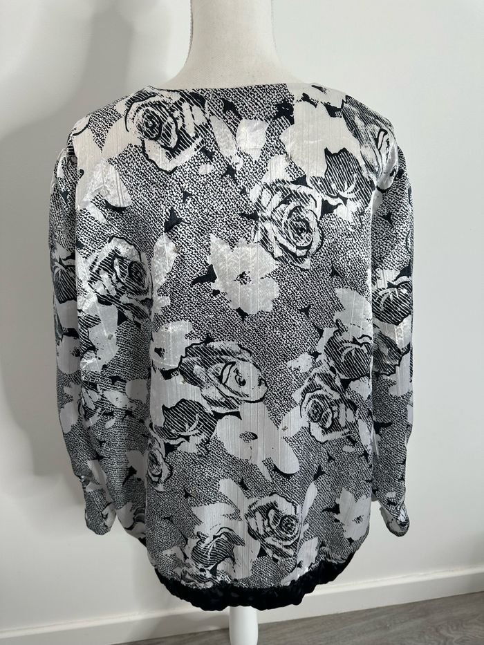 Blouse oversize satinée blanche noire argentée à fleurs Vintage T44 XXL - photo numéro 1