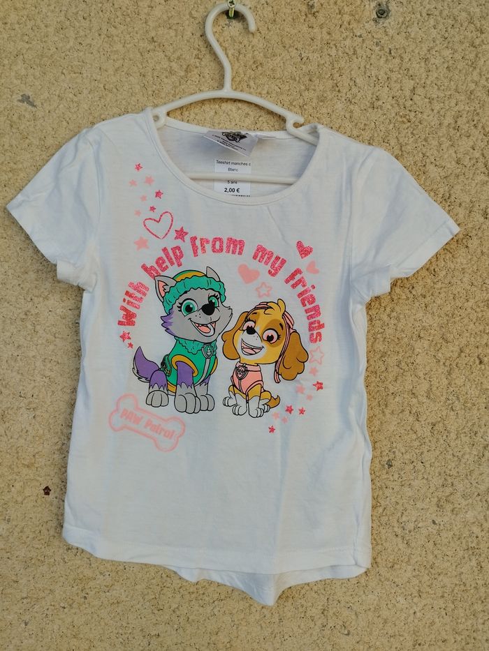Article : tee shirt manches courtes, pat patrouille  Couleur : Blanc et autres  Taille : 5 ans  Marque : pat patrouille  État : très bon état  Prix : 2€