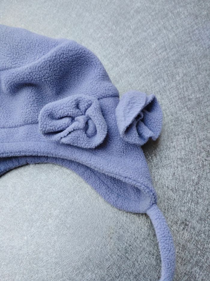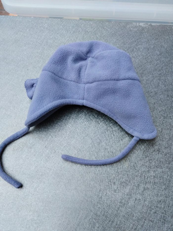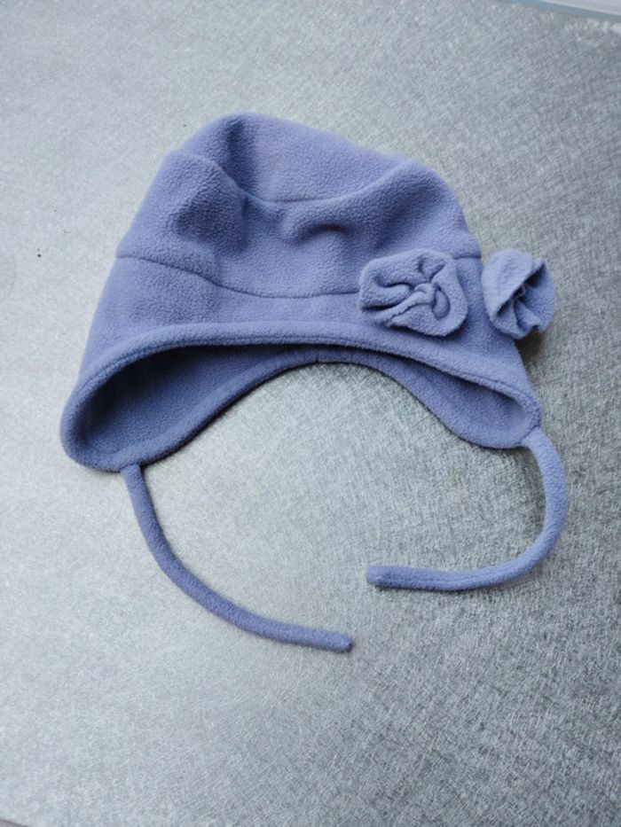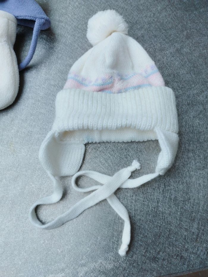 Bonnets et moufles bébé fille 0-3 mois Bonnet acrylique blanc et bande rose, mauve et bleu. Oreillettes et lien. Bonnet violet In Extenso polaire, polyester petites fleurs sur le côté, descend sur les oreilles. Moufles crème sans pouce, l'une élastique détendu Babibou polaire