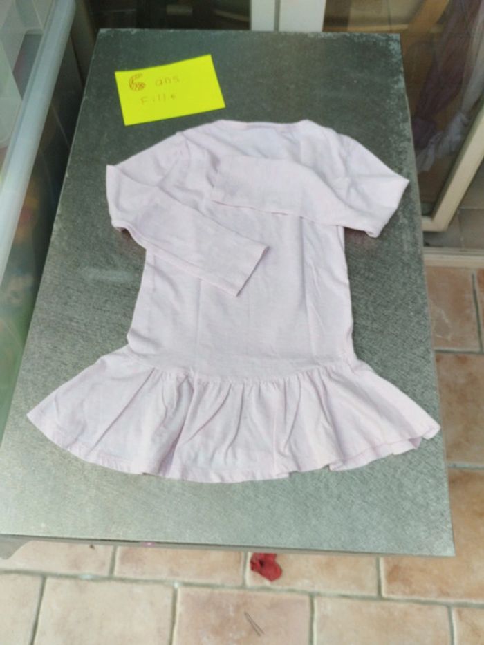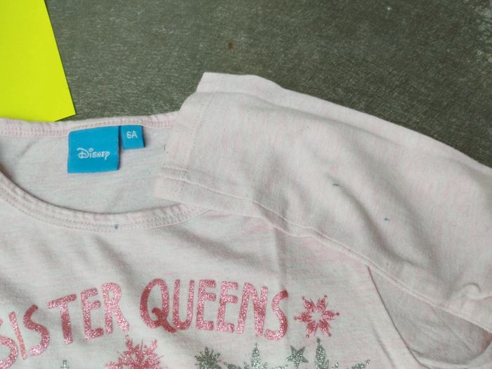 Robe Disney rose Fille 6 ans Rose dessin reine des neiges écriture brillante Tissu assez léger et manches longues. Quelques traces et tâches voir photos