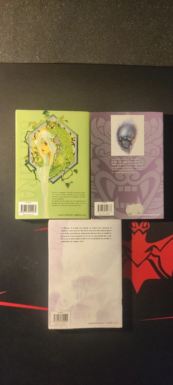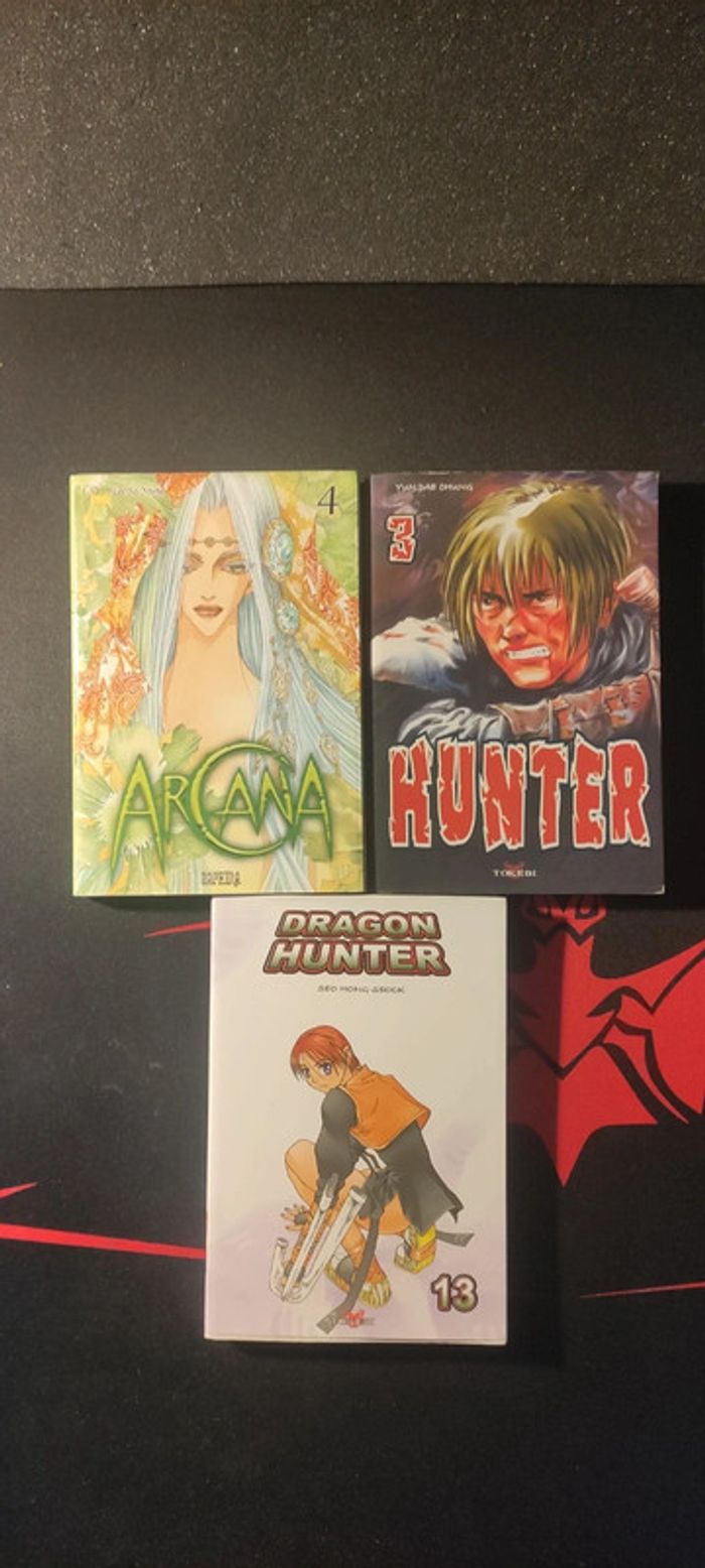 Lot de 3 mangas. Le lot comprend : - Arcana, tome 4 : 2€ - Hunter, tome 3 : 4€ - Dragon Hunter, tome 13 : 3€ Le prix est pour le lot, mais vous pouvez acheter à l'unité en m'envoyant un message (voir prix au dessus). Ils sont en bon état, les pages sont un peu jaunies. Quelques traces d'étiquettes et de colle d'étiquettes sont visibles à l'arrière du manga.