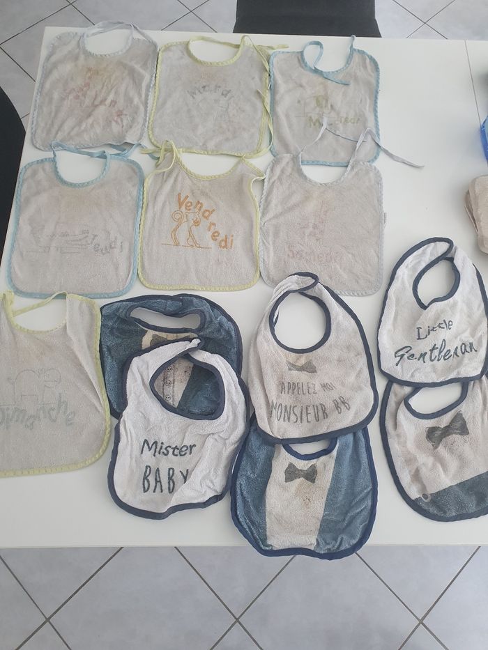 Gros lot bavoir X7 grand classique avec jour de la semaine X6 plus petit à scratch Ils ne sont pas impeccable mais peuvent largement servir encore