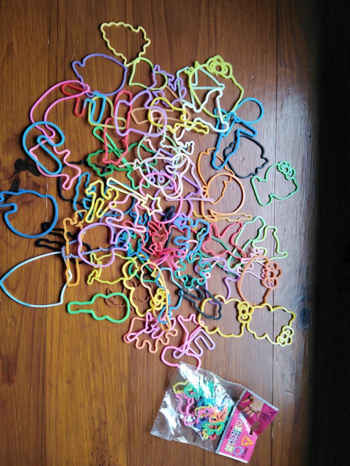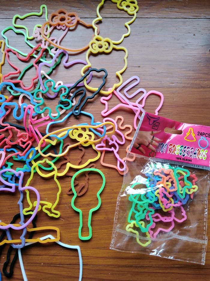 Lot de 74 bracelets et 26 bagues élastique de formes et couleurs différentes : chats, hello kitty, voitures... Prix du lot : 2 €
