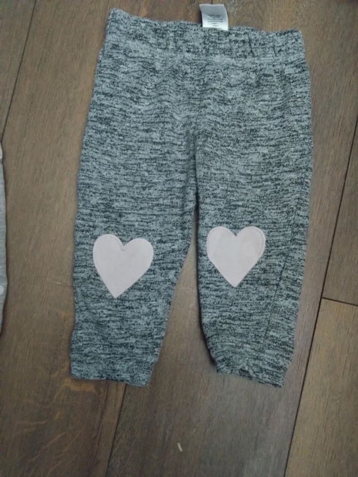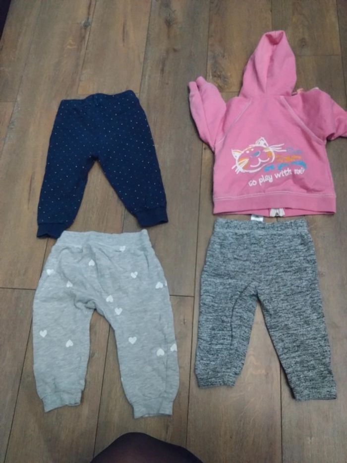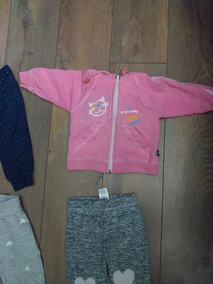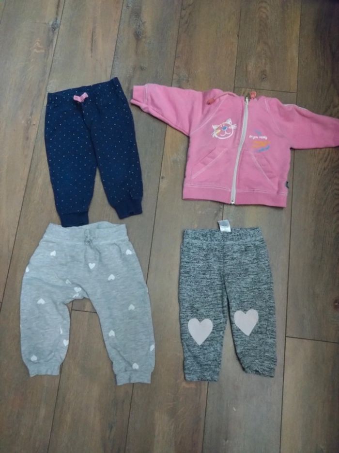 Lot de trois pantalons jogging Et un sweat gilet t a capuche Un pantalon 6 9 mois Primark 74 cm Un pantalon h&m 9 12 mois 80 cm Un pantalon 9 12 mois early days 80 cm Gilet rose 9 mois