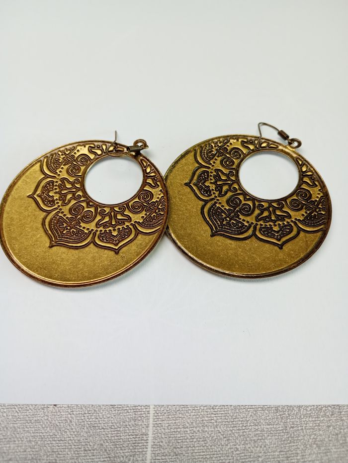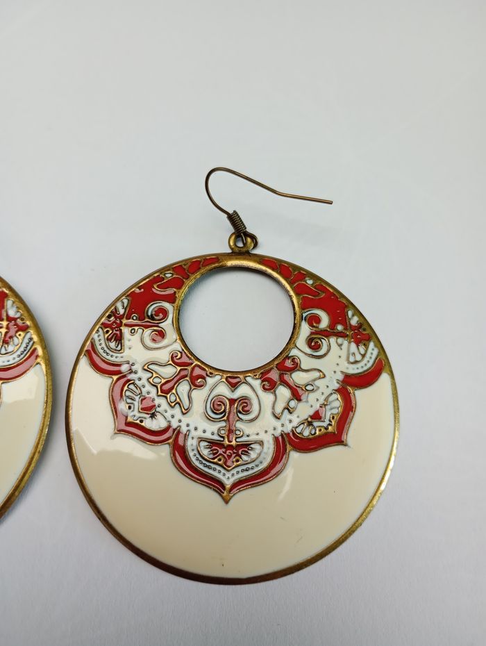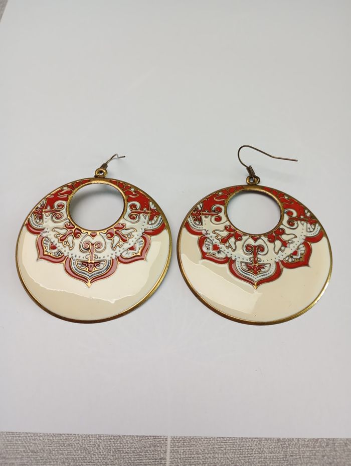 Boucles d'oreille avec motifs rouges et crème. Diamètre : 5,5 cm. Très bon état.