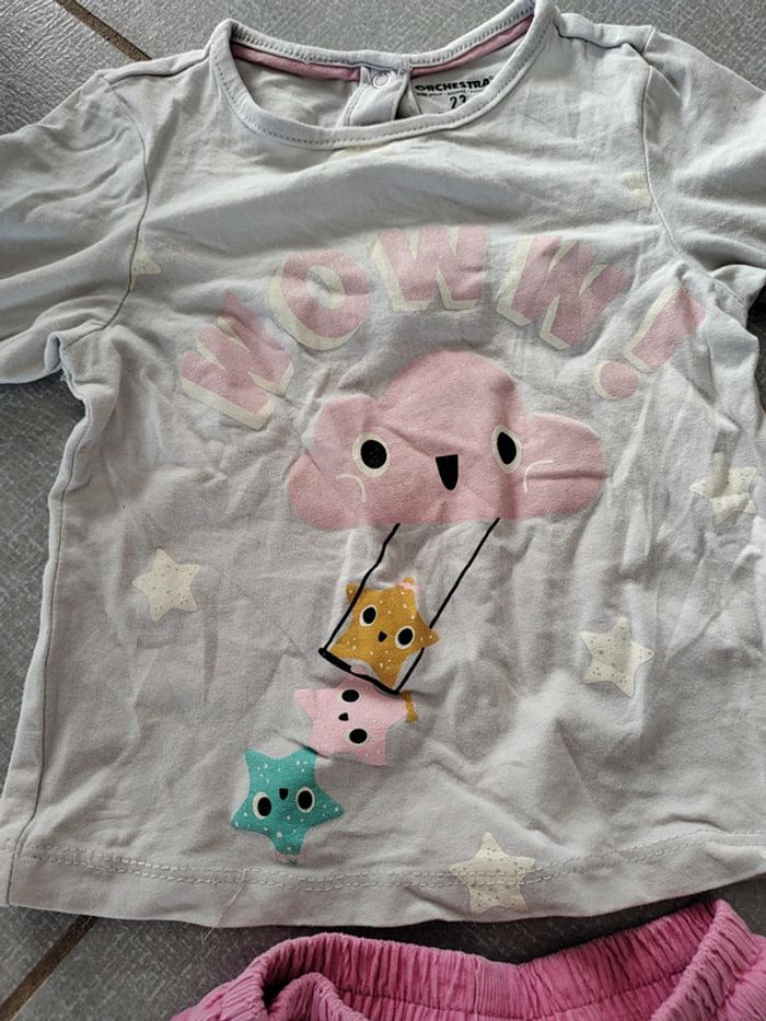 • 1 t-shirt manches longues motif nuage étoiles à paillettes et inscription "wow". Boutons pression à l'arrière