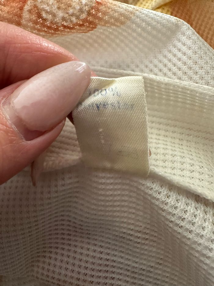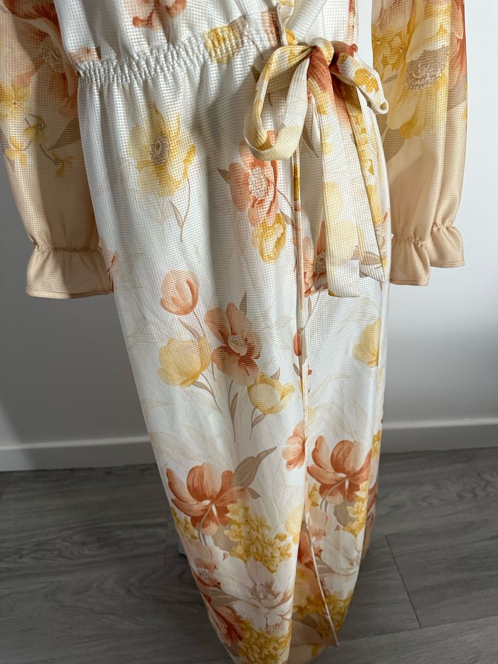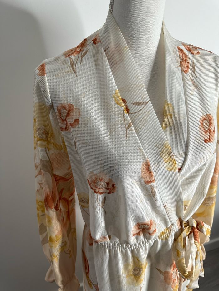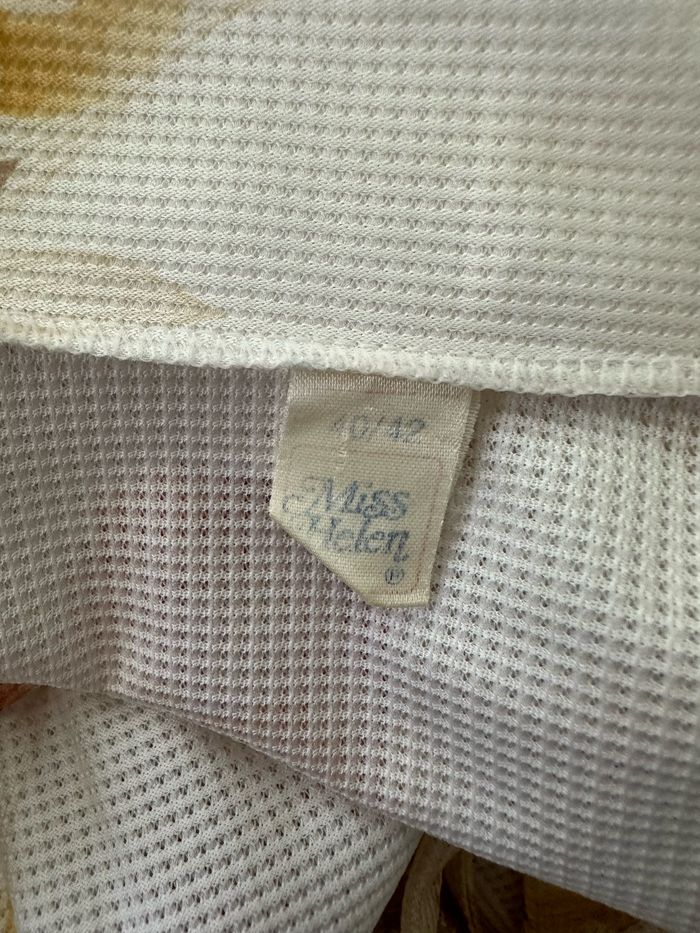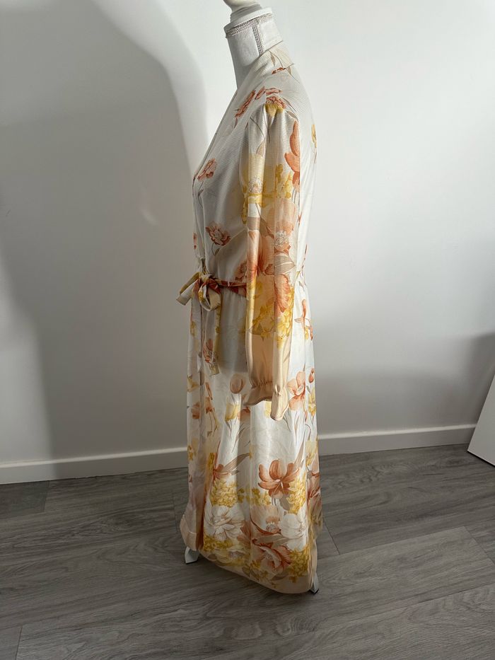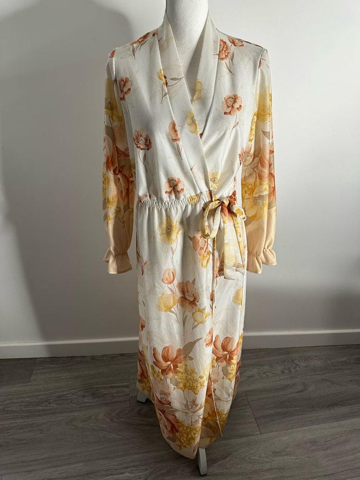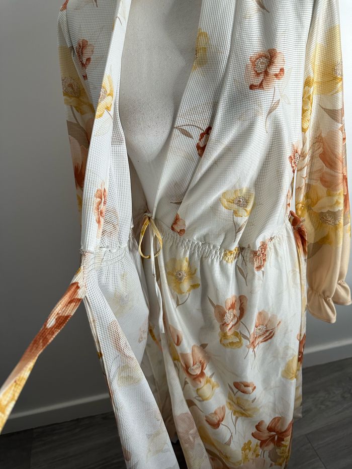 Peignoir kimono long - Excellent état - Taille 40/42 équivalent L/XL - Blanc et orange - Imprimés fleurs - Miss Helen Vintage, années 80’ - Ceinture à là taille - Lien à nouer à l’intérieur - Tissus gaufré légèrement ajouré - Élastique au niveau des poignets et à la taille - 100% polyester
