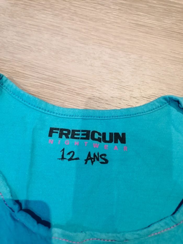 Bonjour, je vends ce débardeur bleu de la marque Freegun taille 12ans en très bon état. Lavé maison non fumeur.