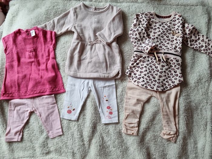 3 ensembles en 3 mois marques diverses pour la manche courte et kiabi les 2 autres. tous en très bon état sauf légère tâche au niveau de l épaule sur celle du milieu ( je pense part au lavage)et legging de droite un peu bouloché.