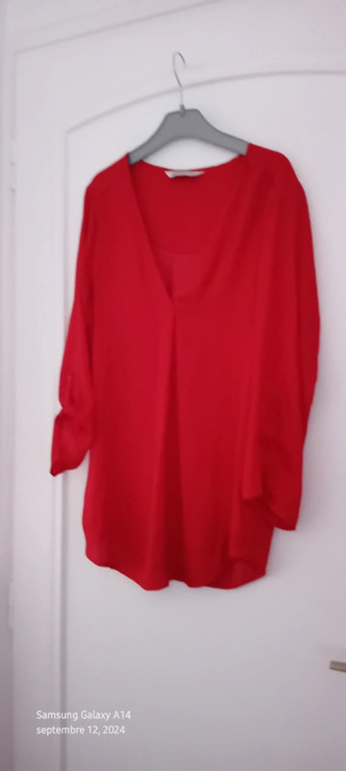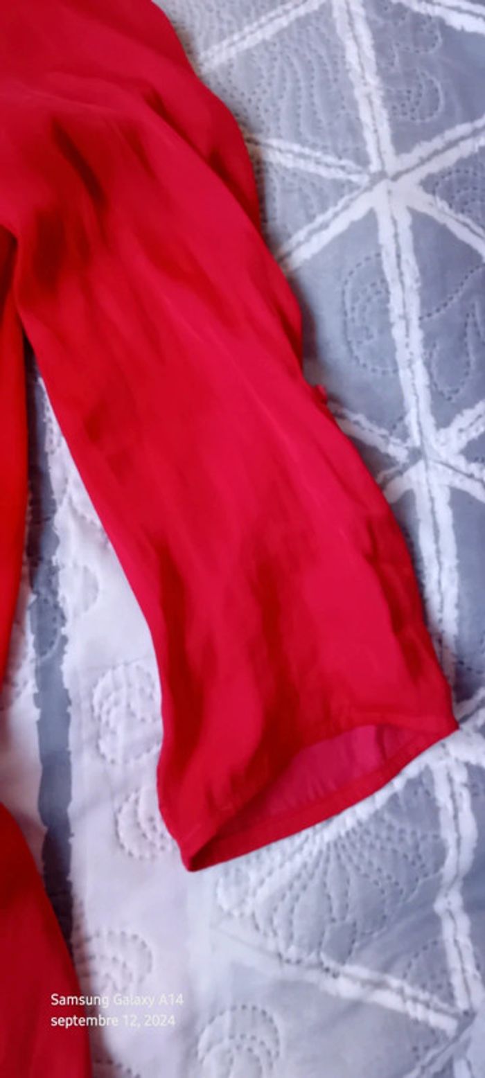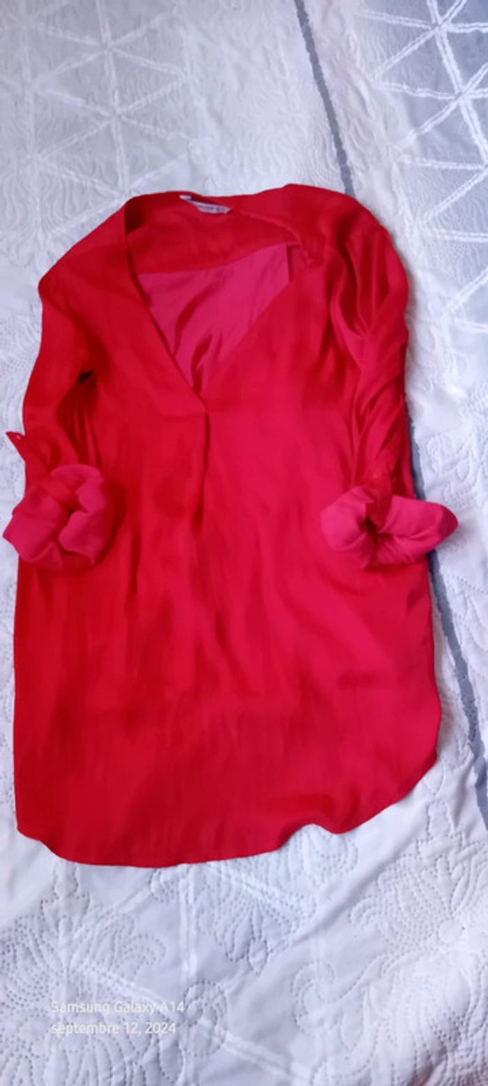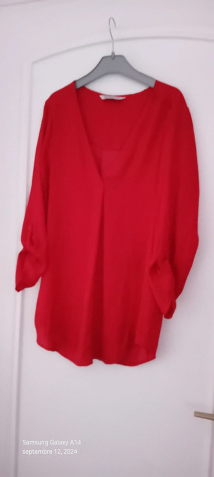 Blouse décolleté en V en polyester matière fluide et satinée aspect soie manches réglables avec un bouton pour les raccourcir longueur 68 cm largeur aisselles à aisselles 45 cm largeur épaules 37 cm très peu porté en très bon état #midolefemme #midole #midolefemme36 #blousefemme36 #femme36 #stravidarius #rouge #blouseaspectsoie #manchesreglagles