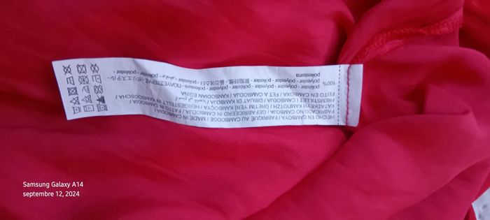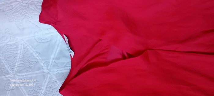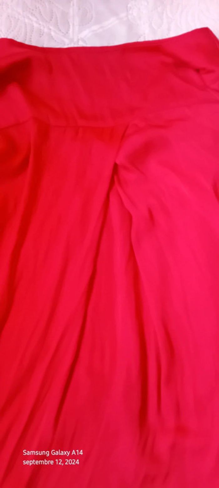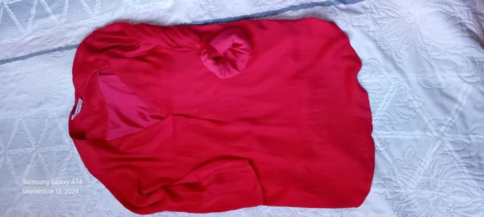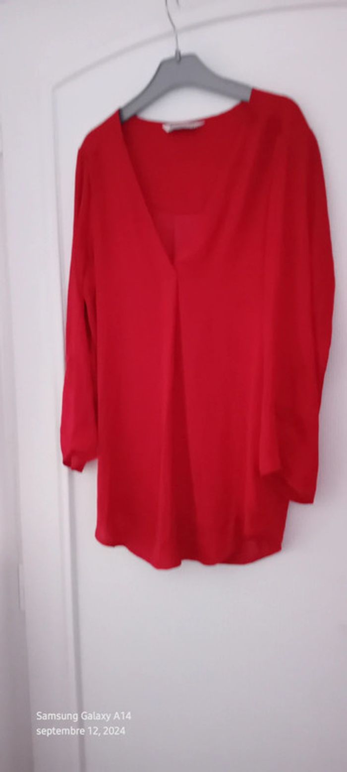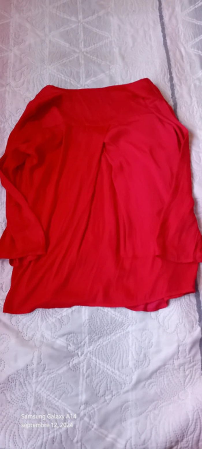 Blouse décolleté en V en polyester matière fluide et satinée aspect soie manches réglables avec un bouton pour les raccourcir longueur 68 cm largeur aisselles à aisselles 45 cm largeur épaules 37 cm très peu porté en très bon état #midolefemme #midole #midolefemme36 #blousefemme36 #femme36 #stravidarius #rouge #blouseaspectsoie #manchesreglagles
