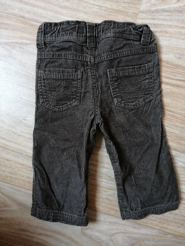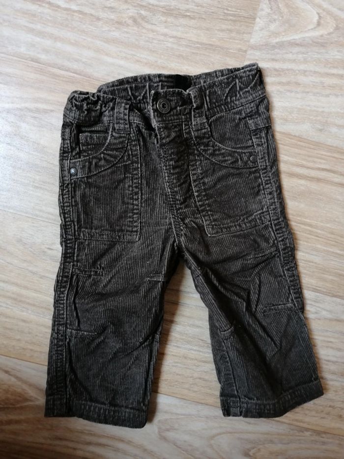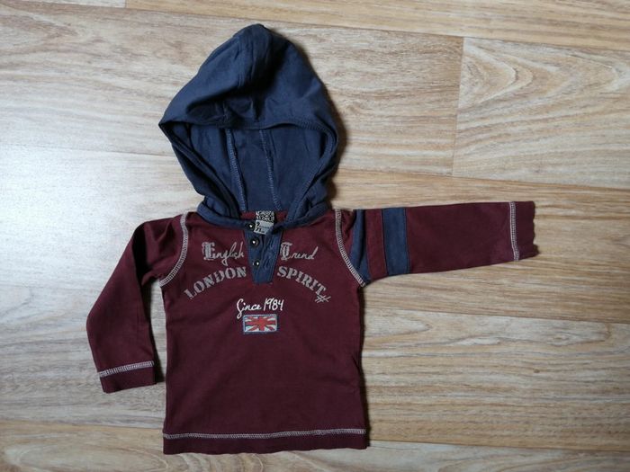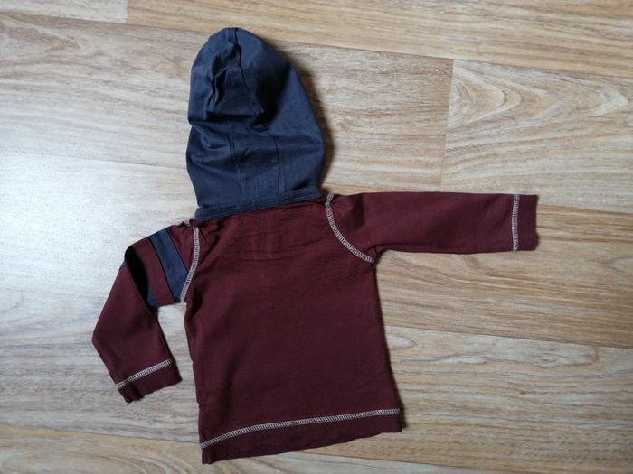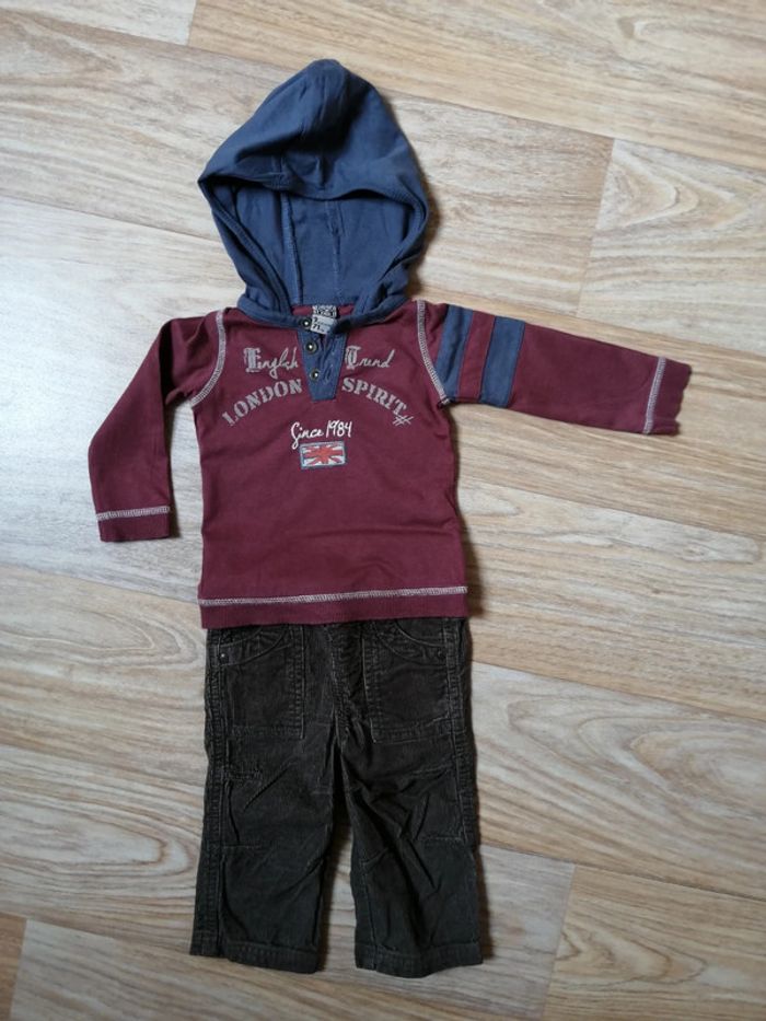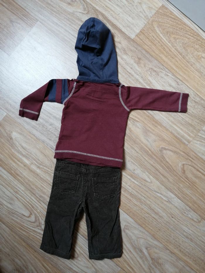 #nad_35_bb_garcon_74 (6-9mois) Ensemble pour garçon haut manche longue à capuche couleur bordeau / bleu grisé et pantalon velour taille ajustable et de couleur marron Marque Tape à l'oeil (TAO) 9 mois / 71 cm Très bon état