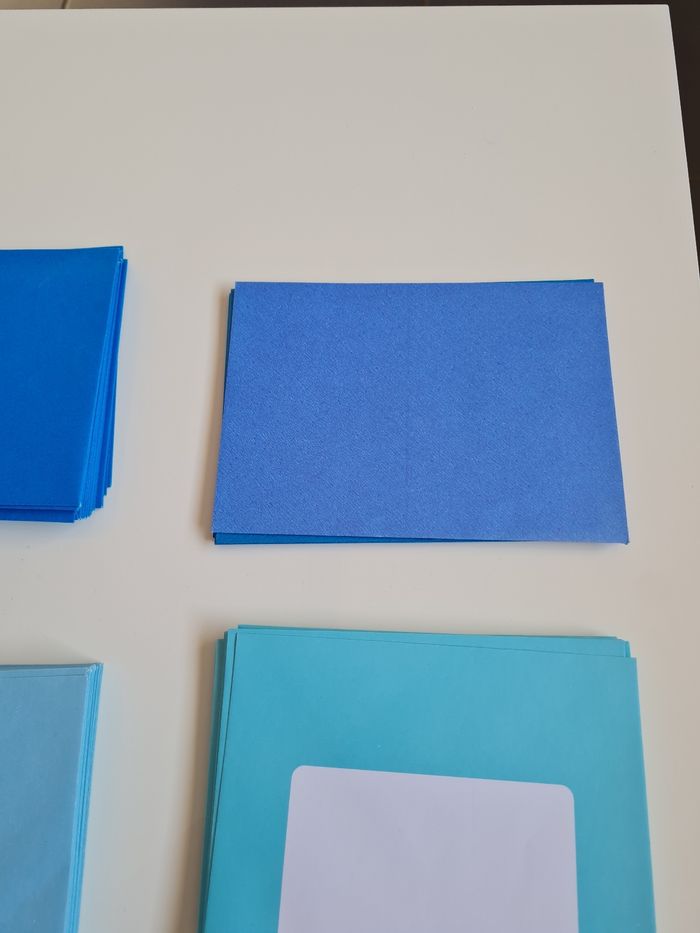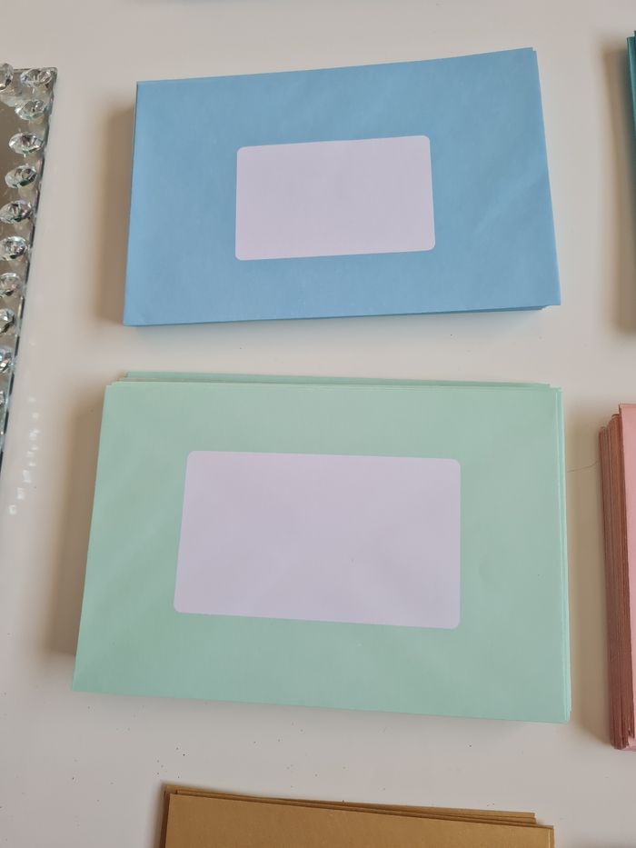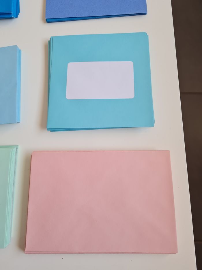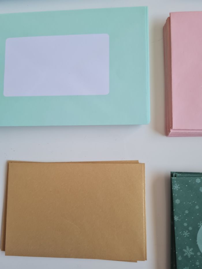 32 enveloppes bleues de 15.5 cm x 11.5 cm 8 métallisées de 15.5 x 11 cm 32 enveloppes bleu pastel de 17.5 cm x 11.5 et 20 de 14 cm x 14 cm 28 enveloppes roses pastel de 17.5 cm x 11.5 cm 36 enveloppes vert pastel de 17.5 cm x 11.5 cm 20 enveloppes vertes noel de 14.5 cm x 11 cm 6 enveloppes dorées métallisées de 13.5 cm x 9 cm