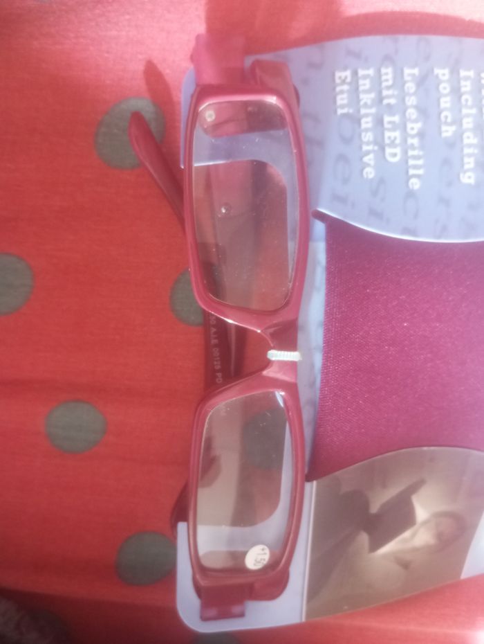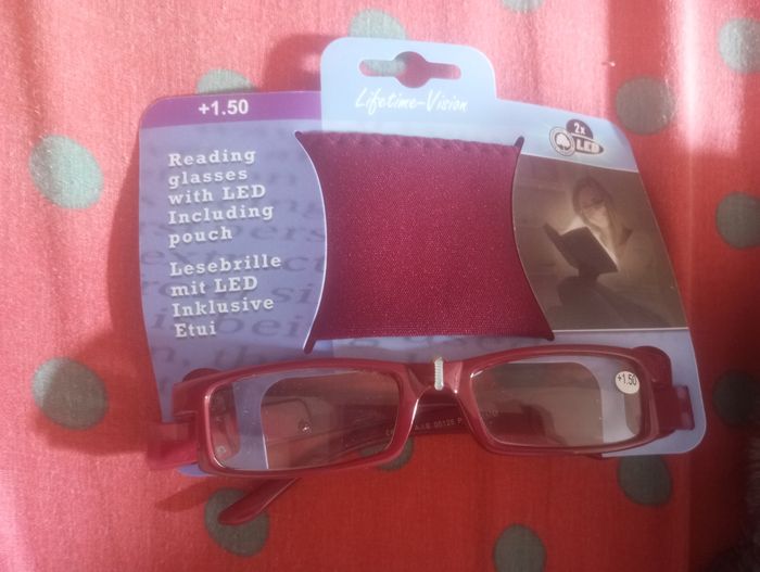 Lunette +1,50 couleur bordeaux rectangulaire avec une lumière led de chaque côté avec son étui neuflife