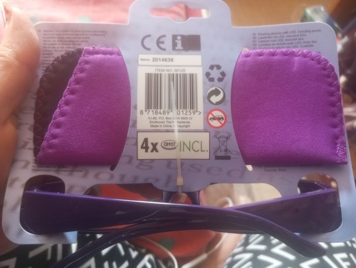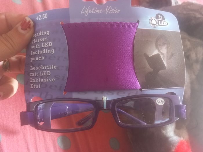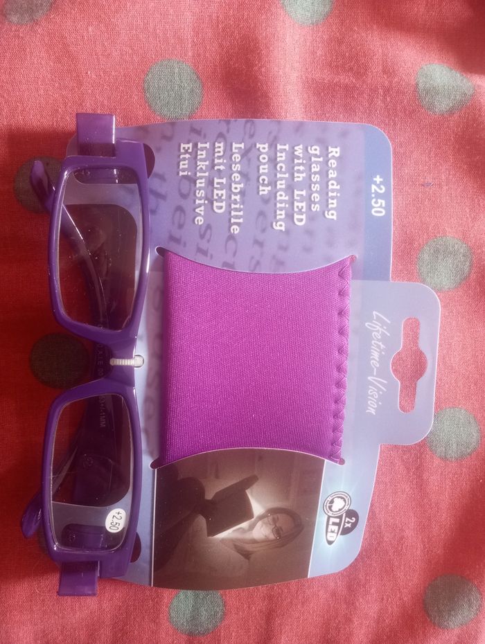 Lunette de lecture ou autre couleur violette+2,50 avec une led de chaque côté forme rectangulaire avec pochette