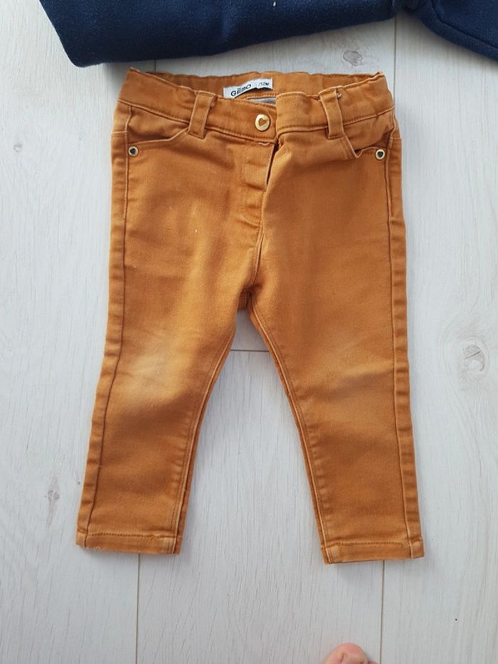 Ensemble gilet légèrement pailletté. Taille 18 mois mais taille très petit. Pantalon gémo moutarde. Taille 12 mois