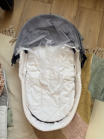 Couffin en très très bon état (presque jamais sorti du support donc les anses sont encore très solides) Un petit accroc (voir dernière photo) mais très bon état Vendu avec le support À venir chercher sur Elancourt
