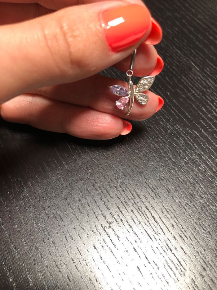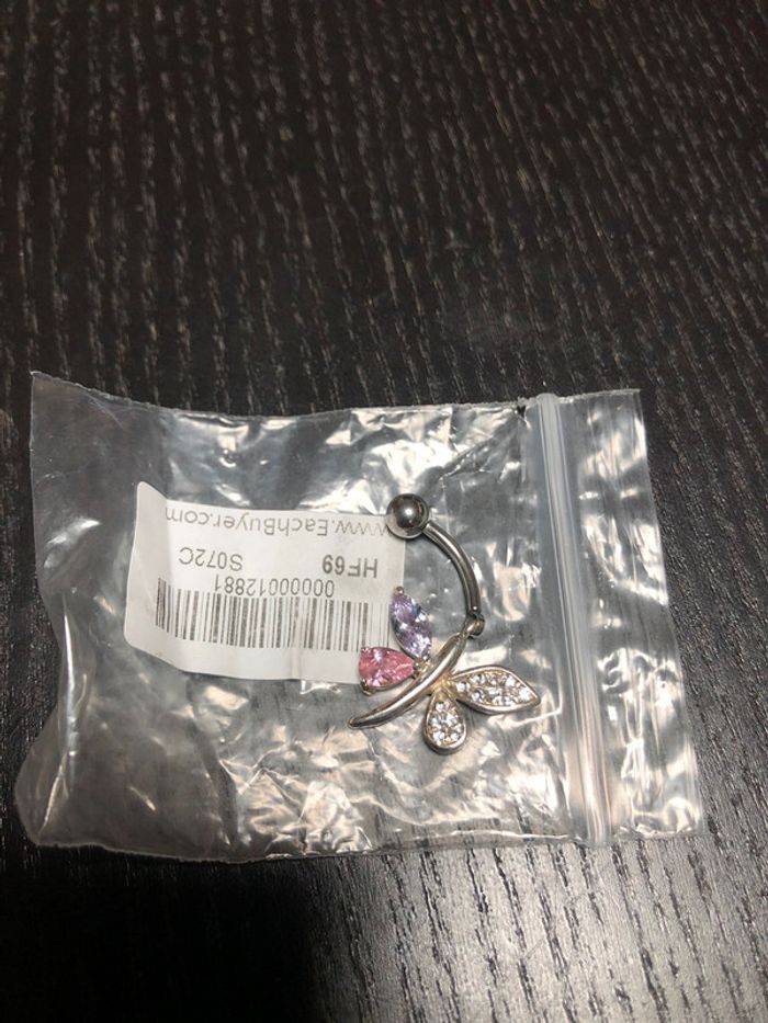 Piercing nombril papillon acier chirurgical strass violet clair rose pâle et clear porté 24h, comme j’ai un bourrelet épais quand je suis assise, le piercing me rentre dans la peau et me blesse, j’ai pas attendu d’être à vif, je m’en sépare à contre coeur car il rend vraiment sympa mais fait pour les centre plus plats ou avec bourrelet moins épais lol