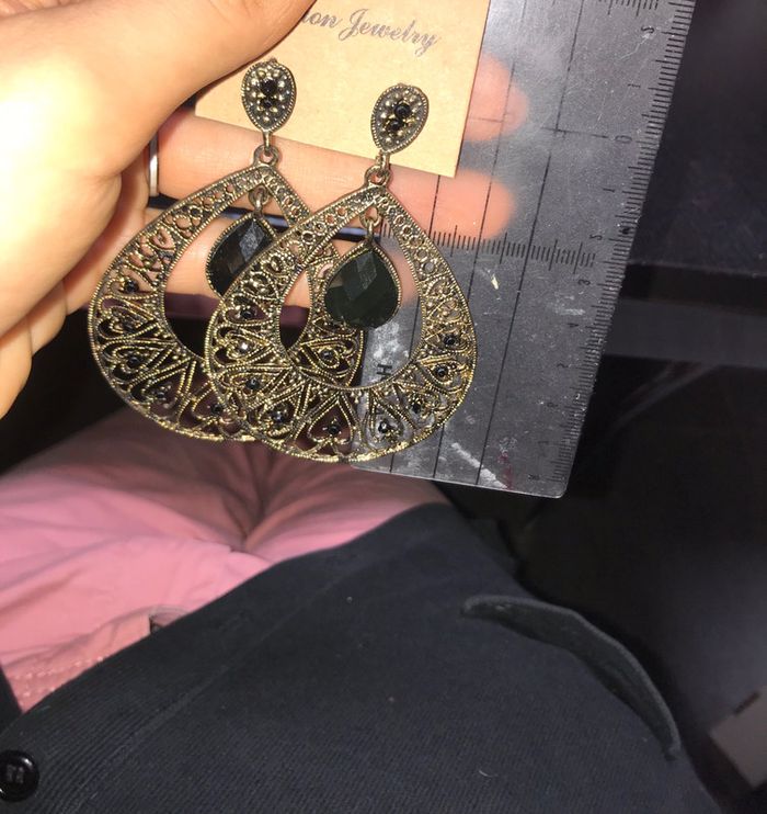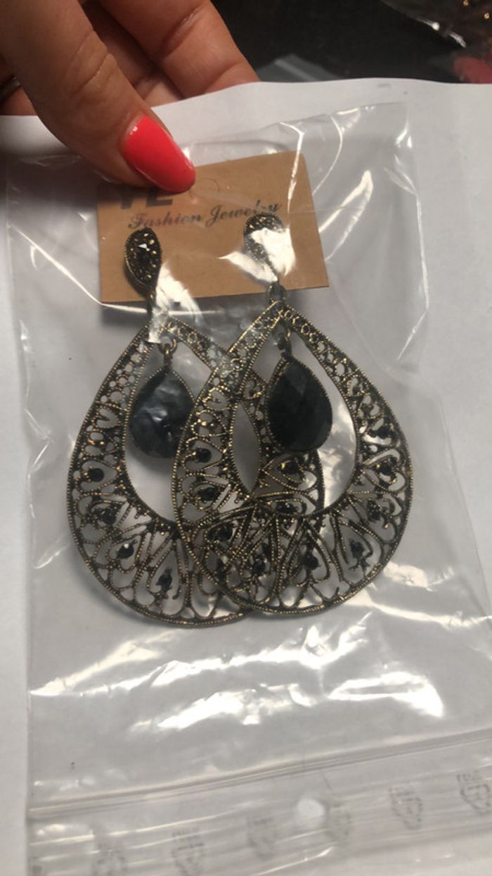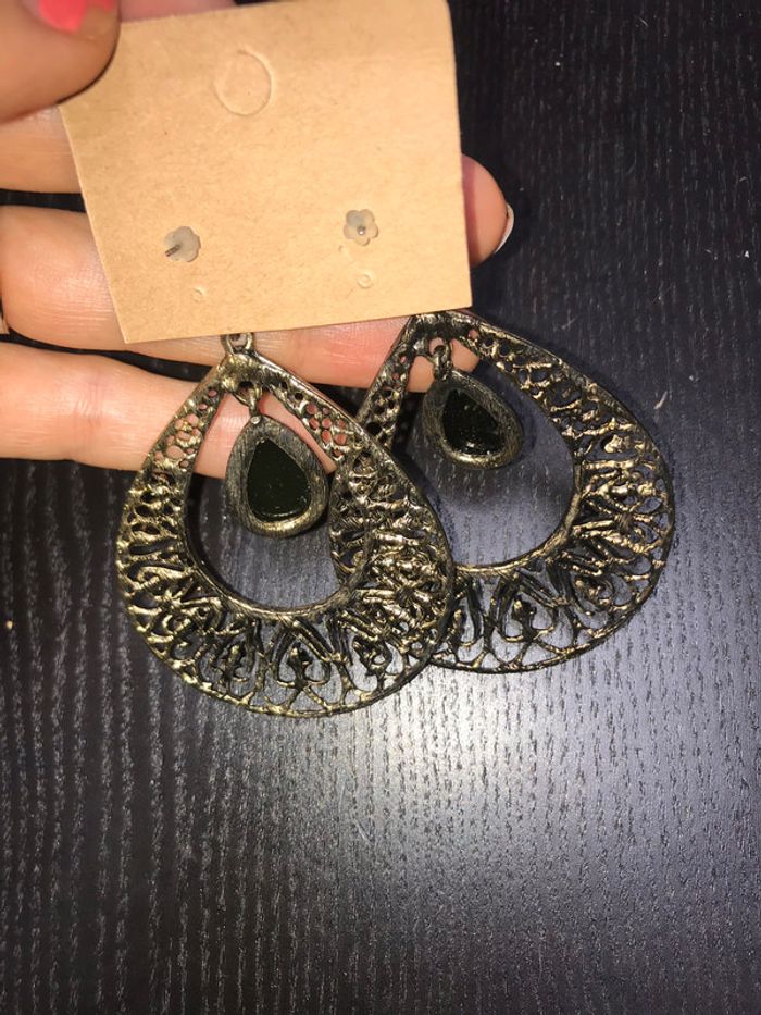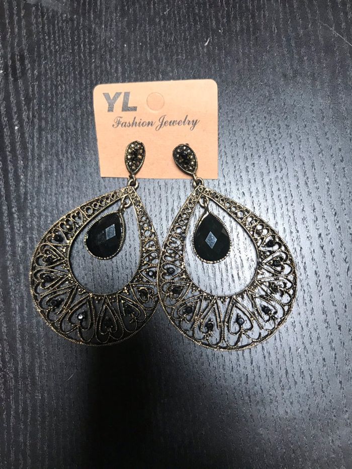 Boucles d’oreille métal dorées strass noir jamais portees