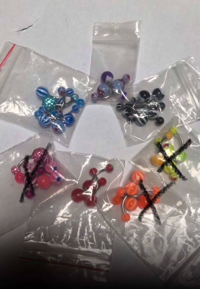 acier inoxydable 1,50€ le sachet ou 5€ les 4 J’en ai trooooop ! Je ne les mets pas car je mets toujours le même et allergie au nickel pour d’autres. Restants : -rouge -bleu -noir -violet 1,5/ sachet ou 5 les 4