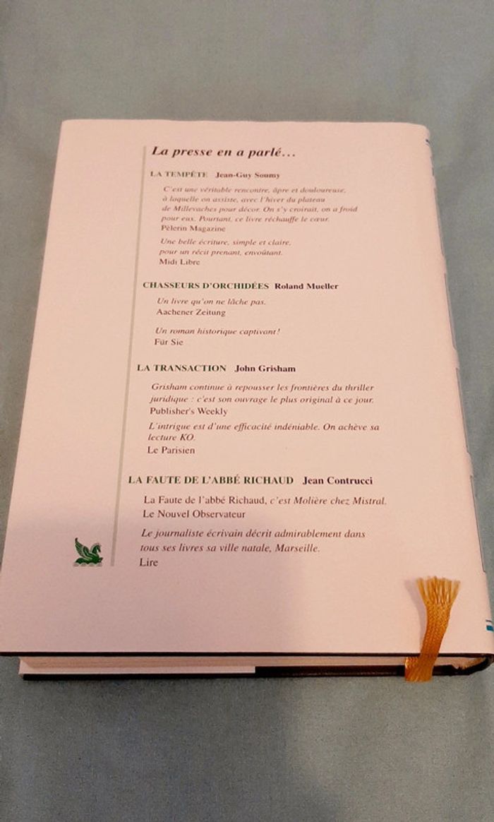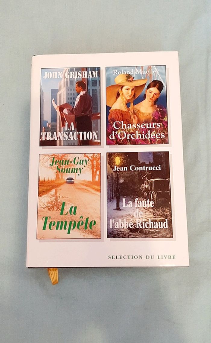 Livre comprenant 4 histoires : 1 : La transaction de John Grisham 2 : Chasseurs d'orchidées de Roland Mueller 3 : La tempête de Jean-Guy Soumy 4 : La faute de l'abbé Richaud de Jean Contrucci -> Selection du Livre