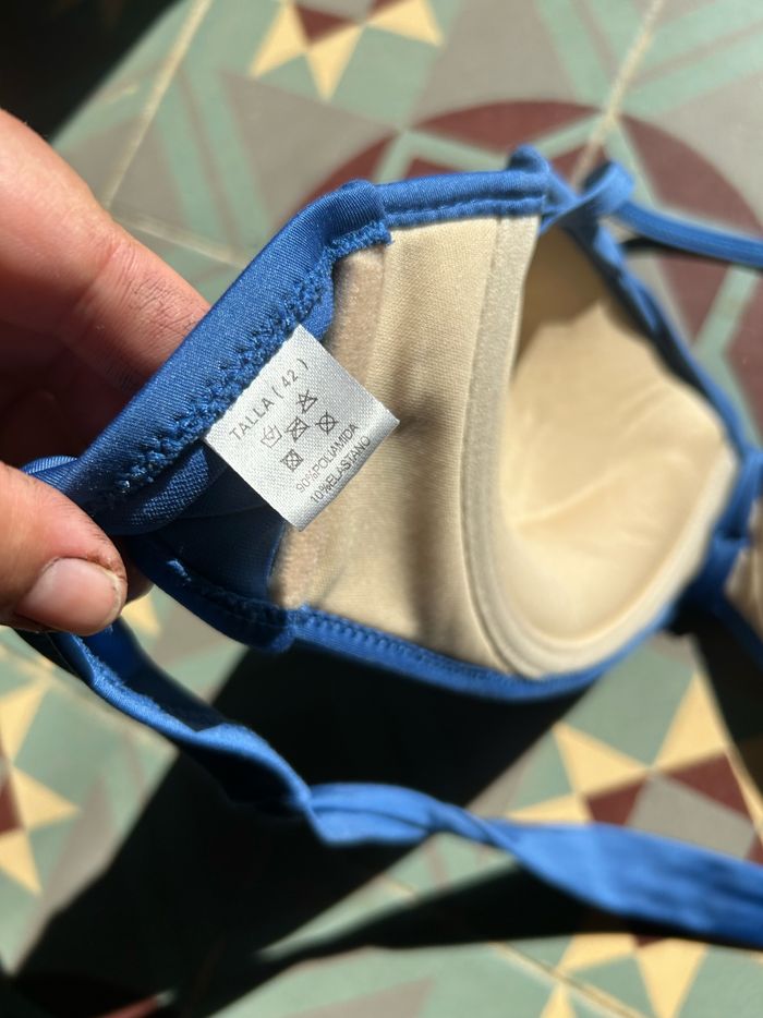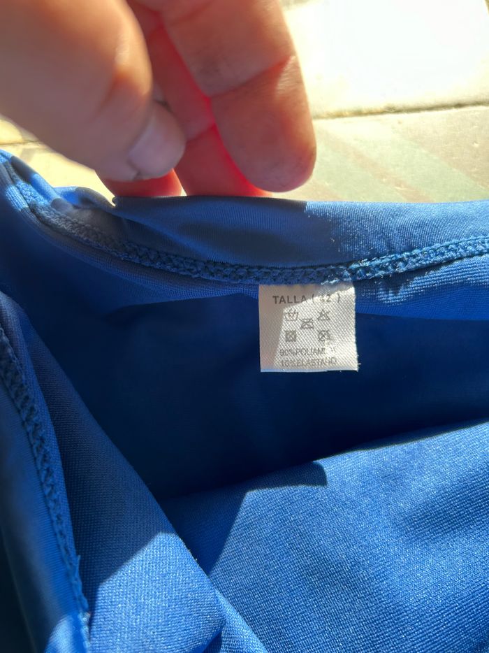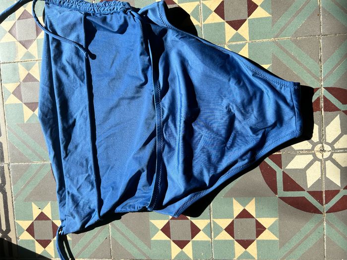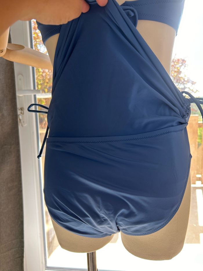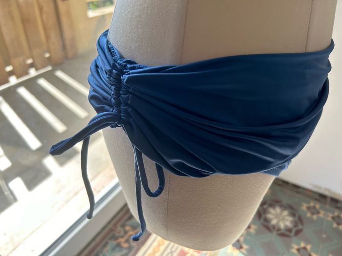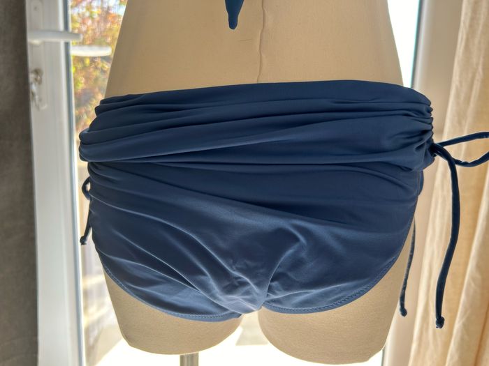 Maillot de bain jamais porté. Matière très douce car il congruent de l’elasthane Soutien gorge rembourré avec bretelles amovibles qui se lavent dans le cou. Culottes ajustables en hauteur grâce à des lacets. Effet drapé sur le soutien gorge et plissé sur la ceinture de la culotte.