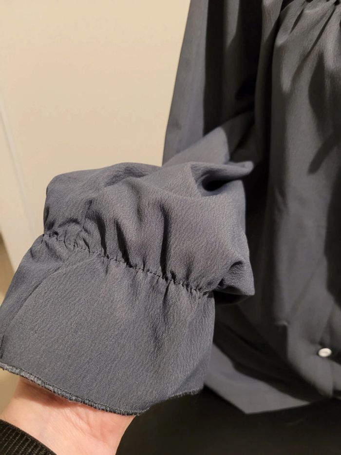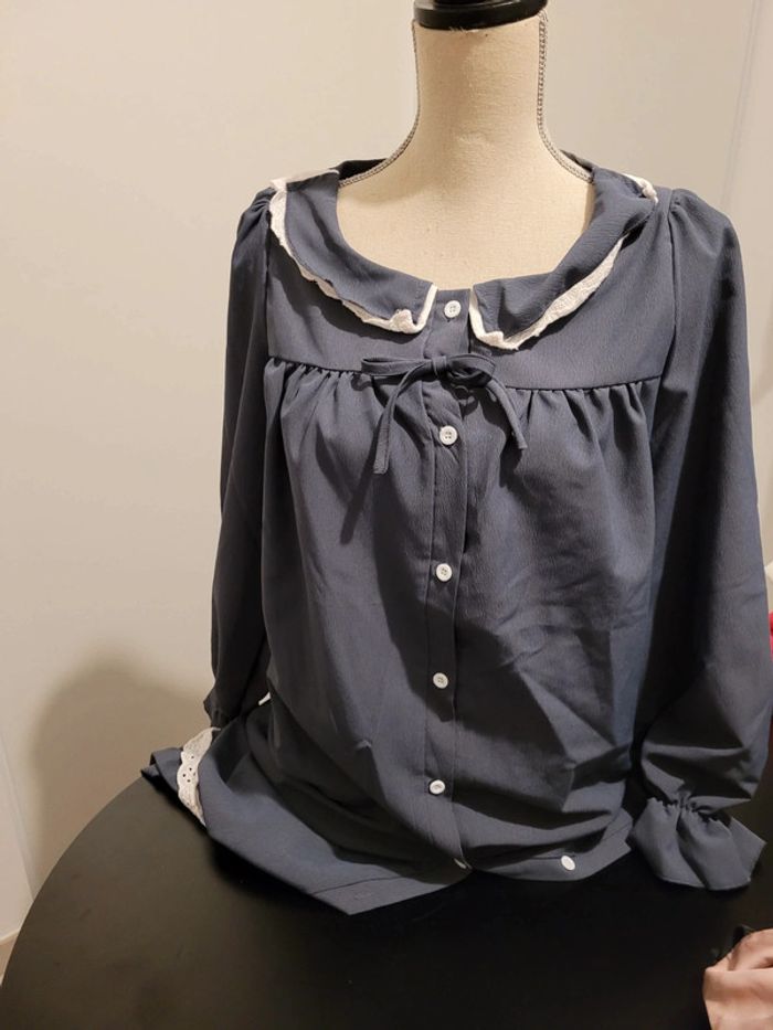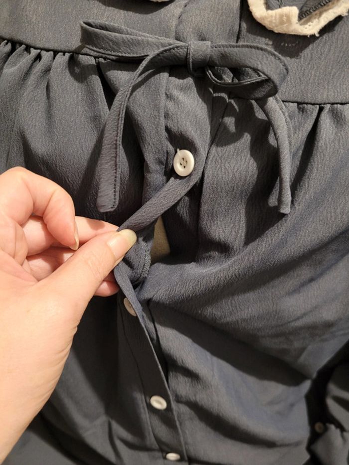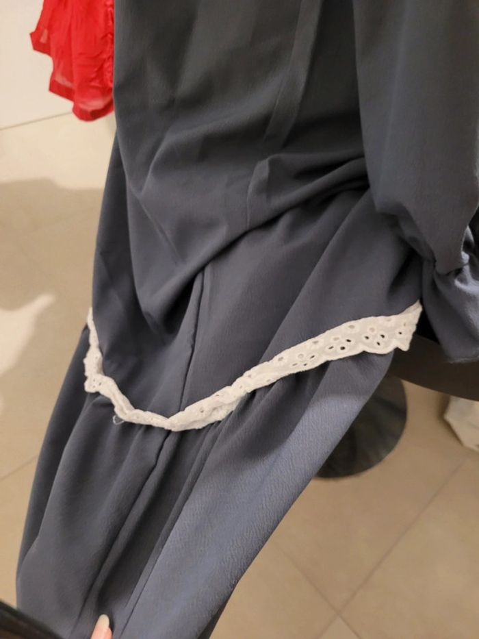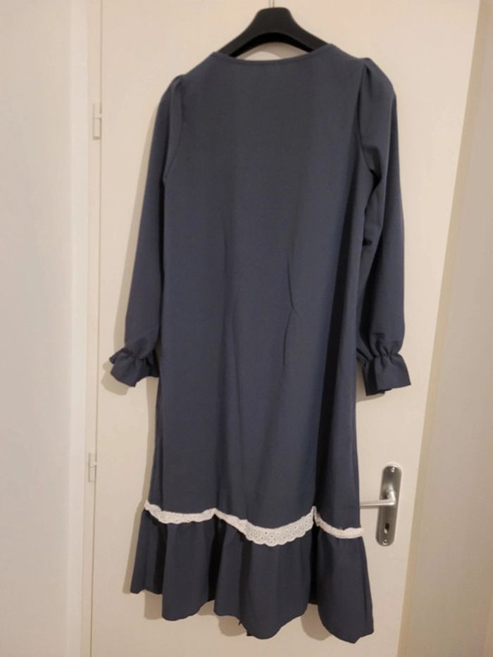 Robe longue souple gris anthracite et blanche environ 115 cm de haut en bas avec dentelles et boutonnière centrale.