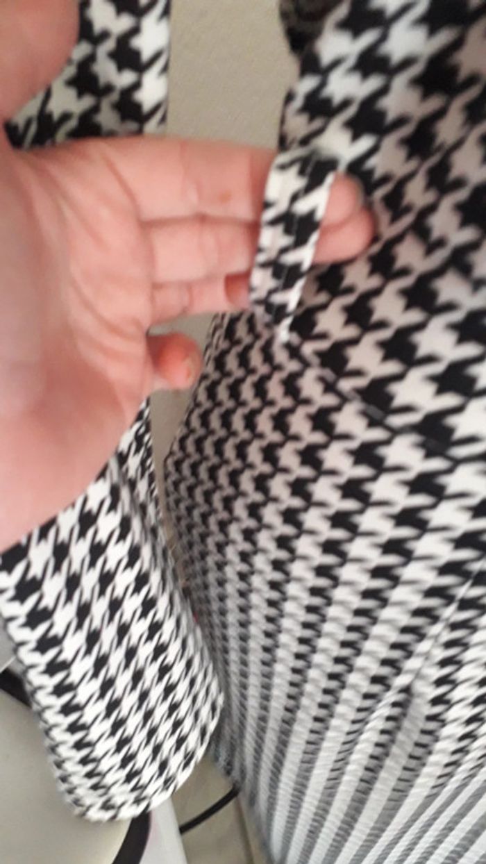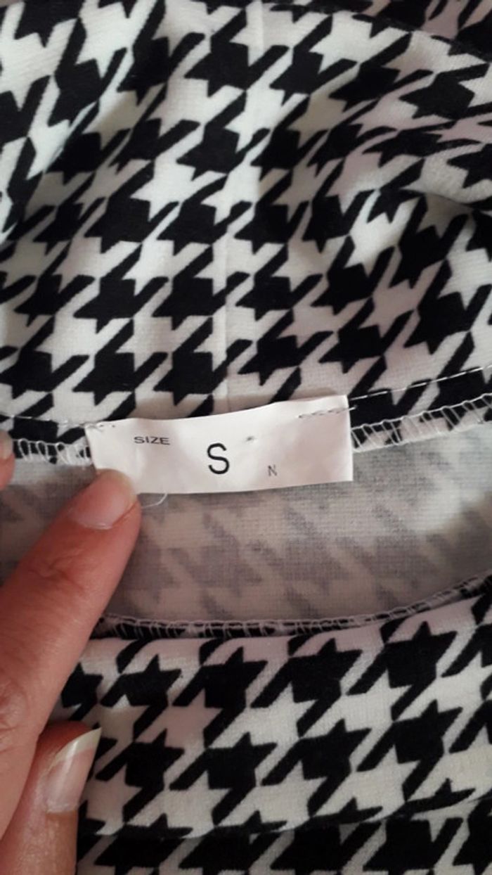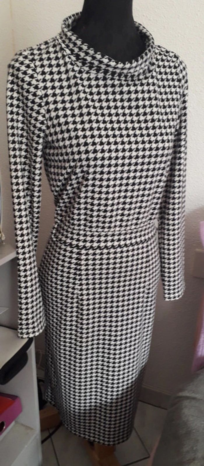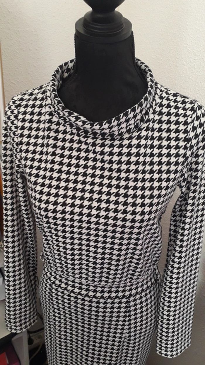 Robe strech mi-longue qui arrive sous les genoux, au milieu des mollets de couleur noire et blanche taille S, tissu très confortable. Possibilité de mettre une ceinture.
