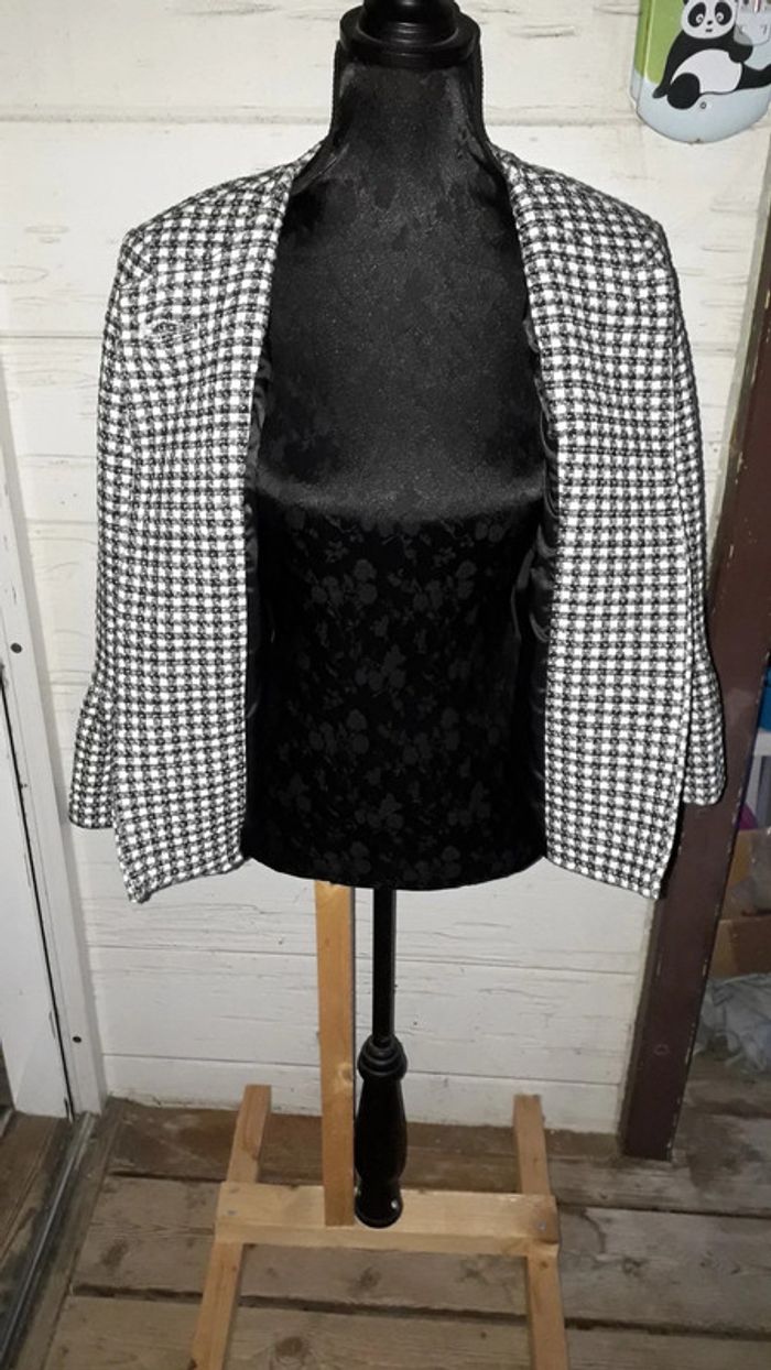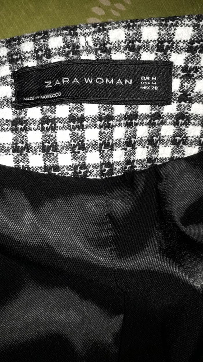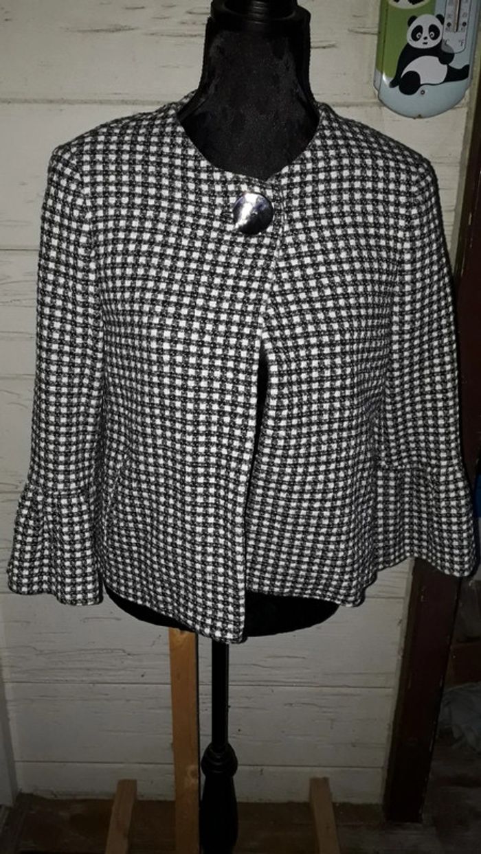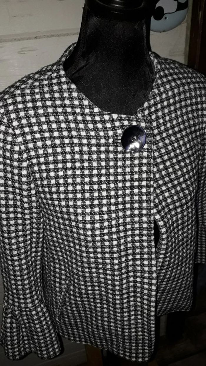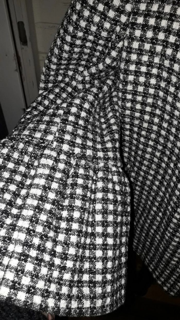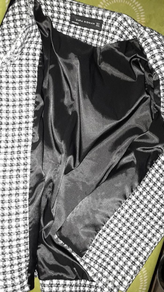 Veste chic mi-saison à carreaux noire et blanche, intérieur en satin, un gros bouton au niveau du col pour la fermeture. Très confortable. Très bon état. Marque : Zara. Taille M.
