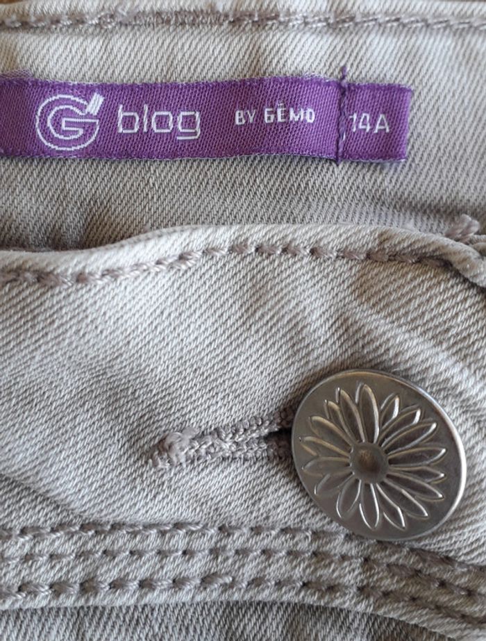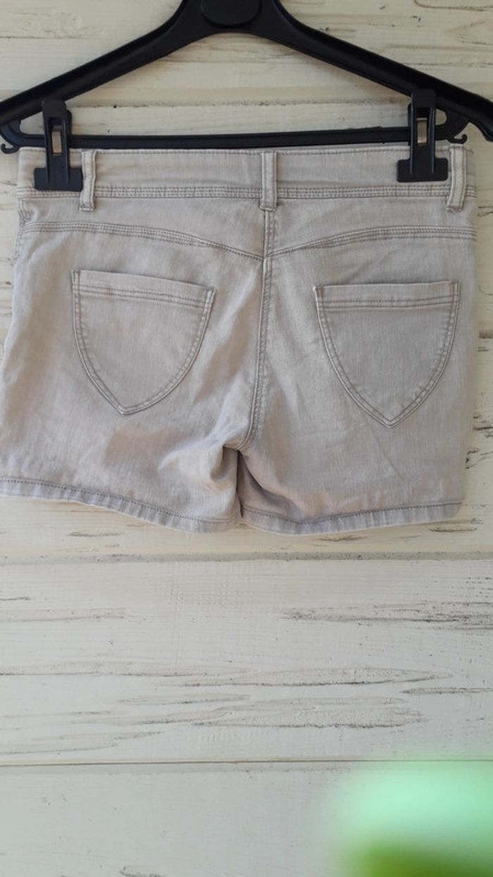 Short gris clair pour fille taille 14 ans de la marque Gémo. Quelques petites tâches sur la cuisse gauche, peu visibles, cf dernière photo.