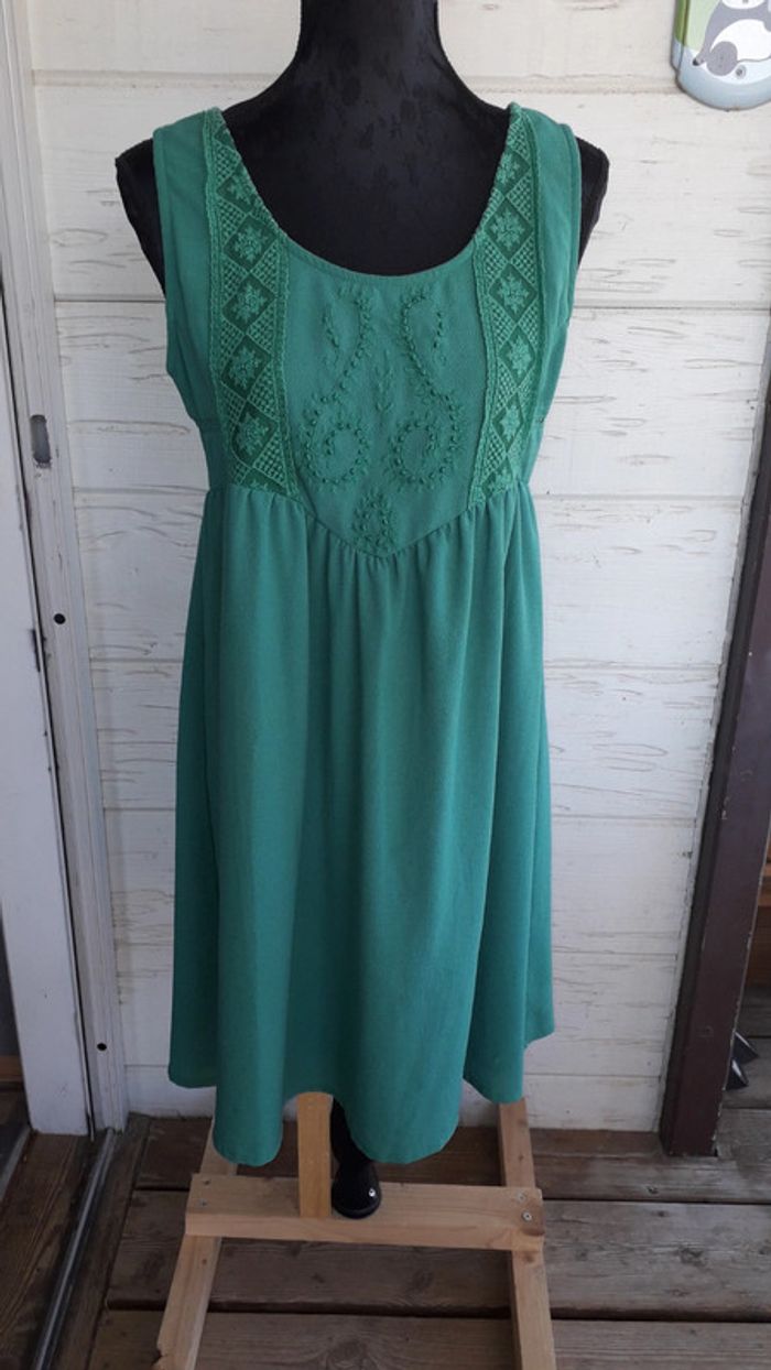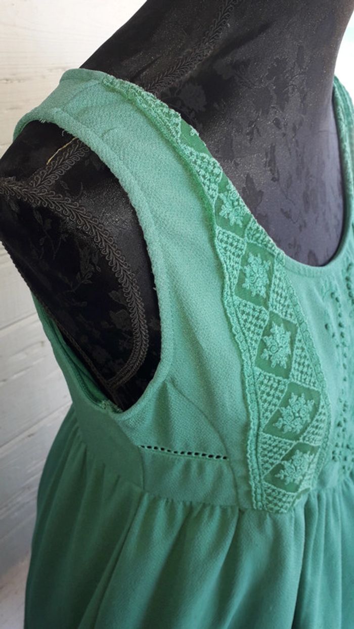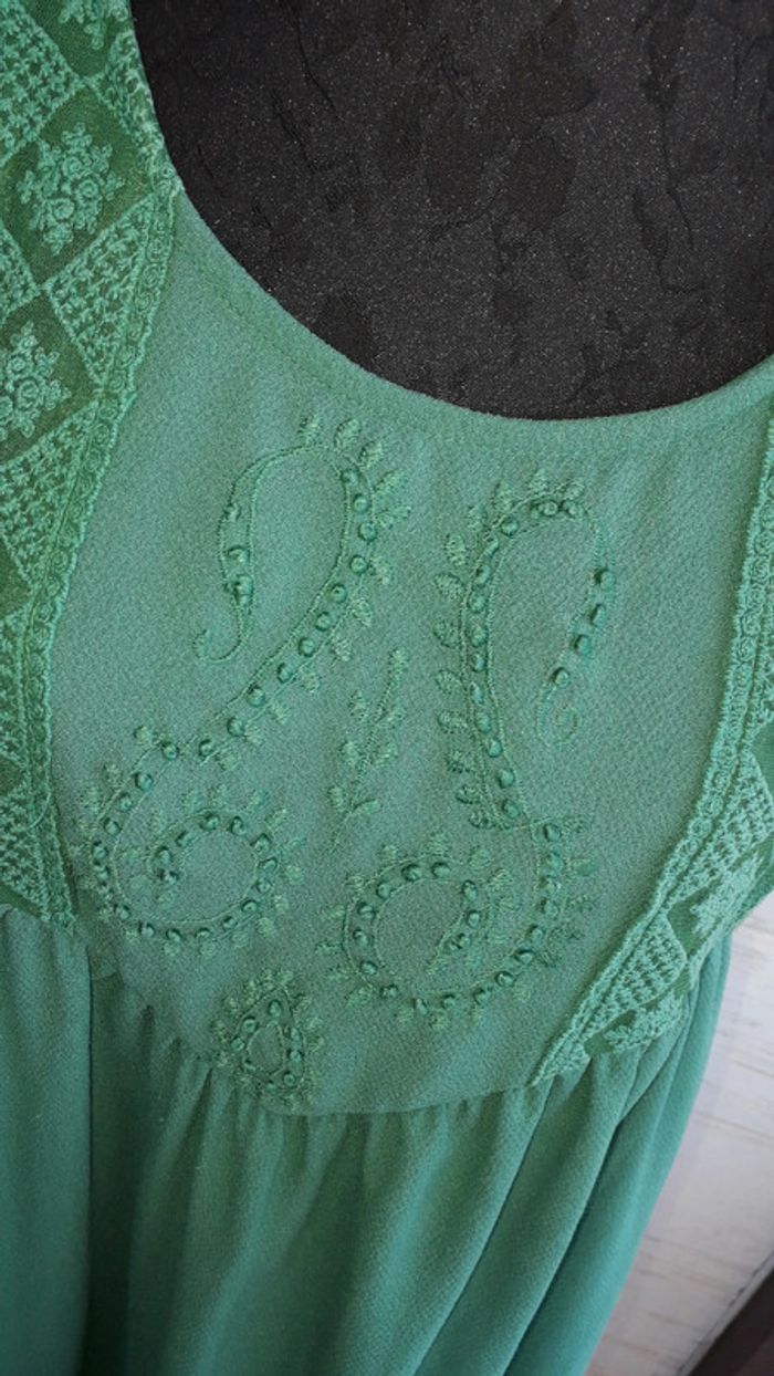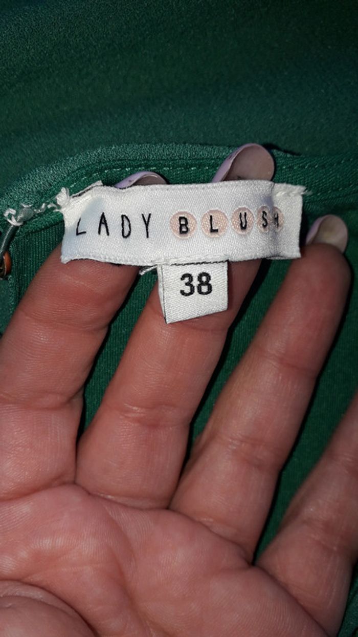 Robe d'été verte taille 38 de la marque Lady Blush. Présence de quelques fils tirés peu visibles (cf dernière photo). De l'épaule jusqu'en bas, elle mesure 90 cm.