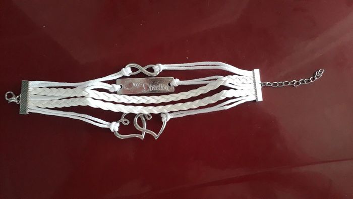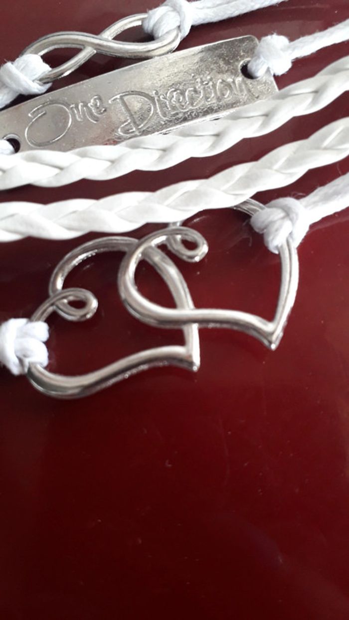Très joli bracelet blanc et argenté avec motifs coeurs, infini et inscription "one direction".