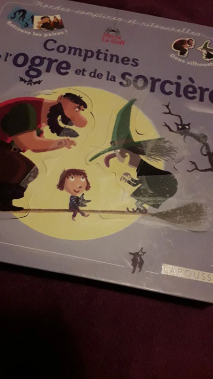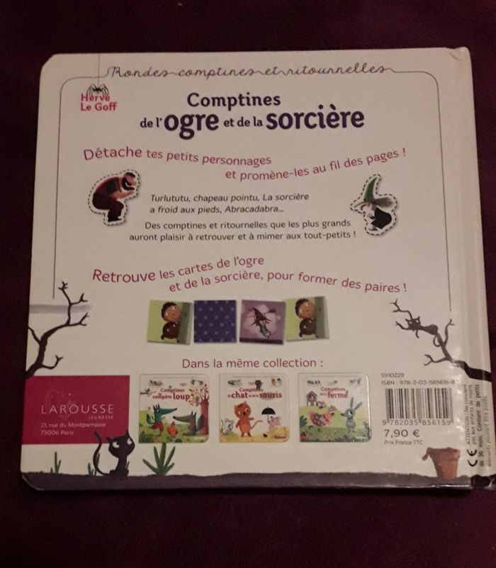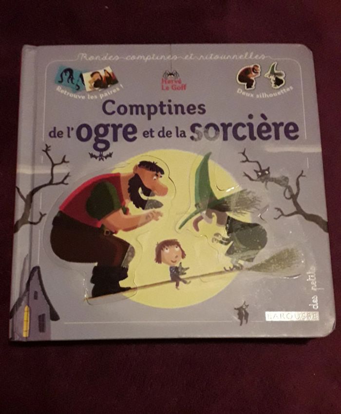Livre comptines de l'ogre et de la sorcière des éditions Larousse. Prix de vente magasin 7,90€. Manque les cartes de jeu à la fin et première de couverture abîmé et réparée avec du scotch (cf les 2 dernières photos).