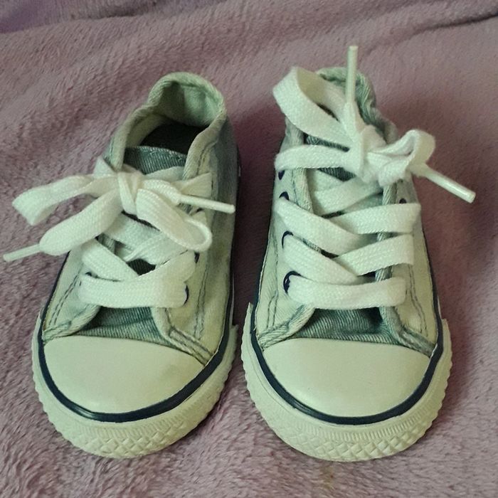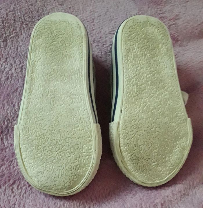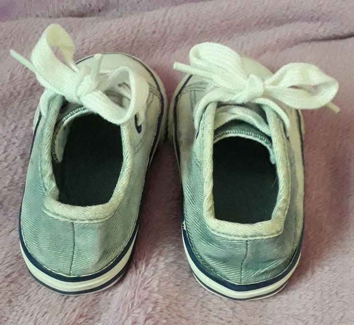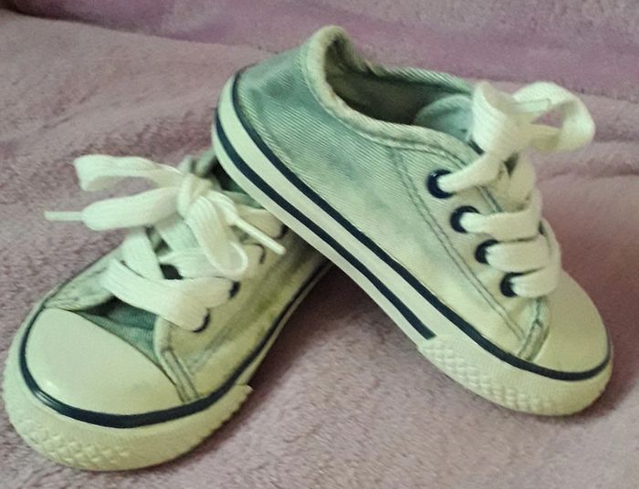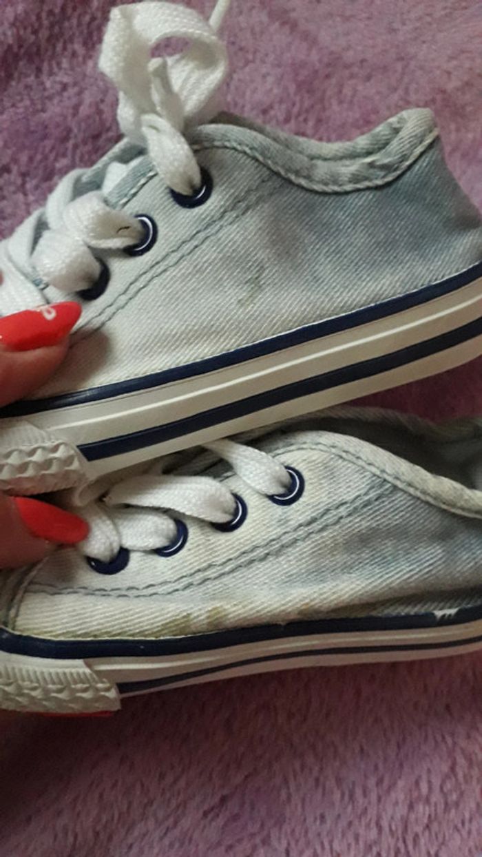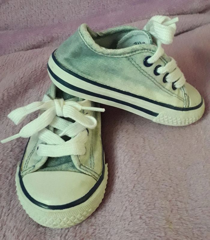 Basket bleu ciel et blanche en jean's de la marque Zara taille 21. Présence de quelques tâches sur le côté, peu visibles (cf dernière photo).