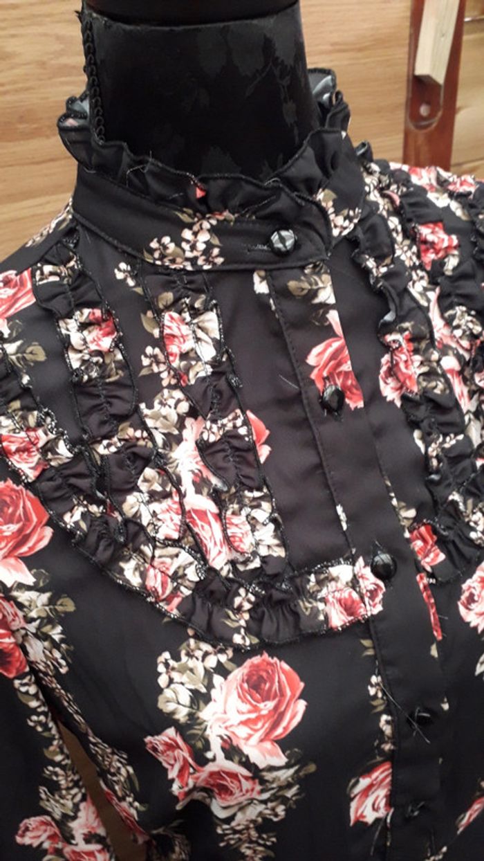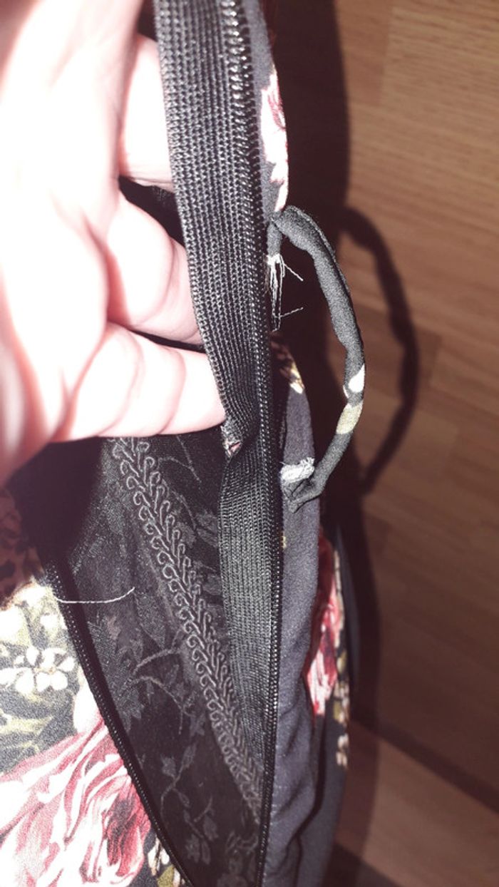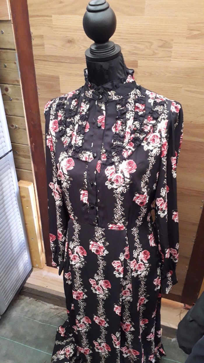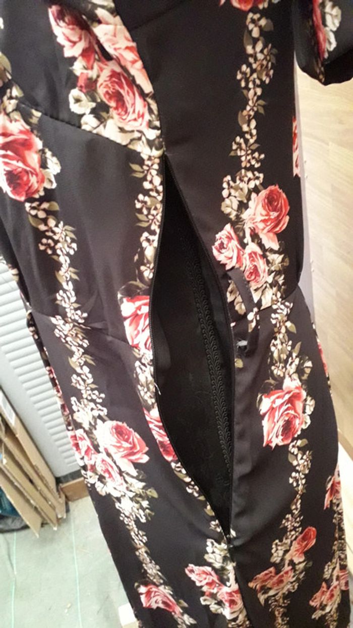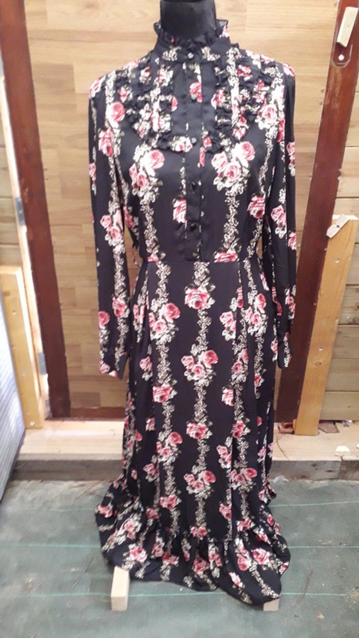 Très belle robe longue noir fleurie taille S de la marque Rinascimento. Quelques fils tirés au niveau de la boutonnière, très léger (cf dernière photo).