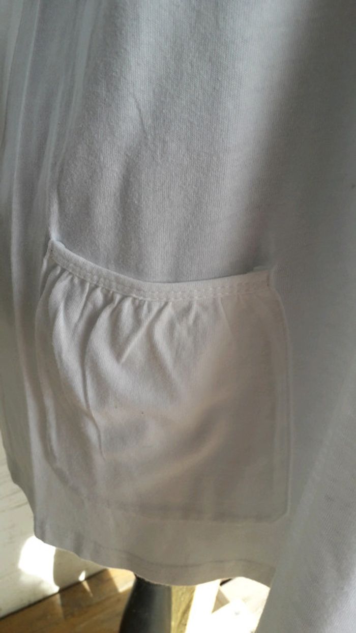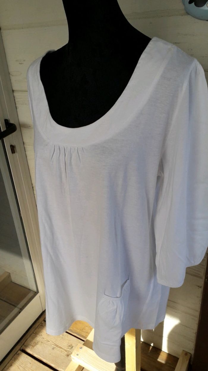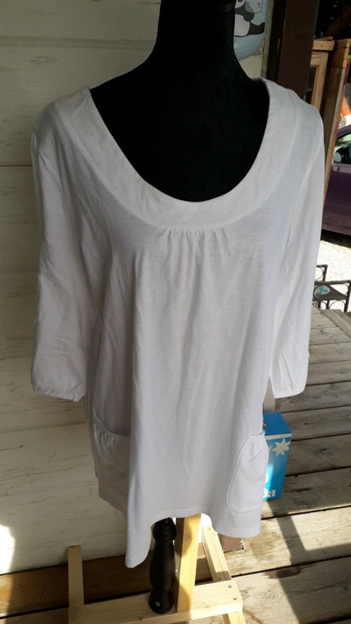 Tee-shirt blanc taille 46/48 de la marque Bleu Bonheur. Manches trois quarts, présence de 2 poches.