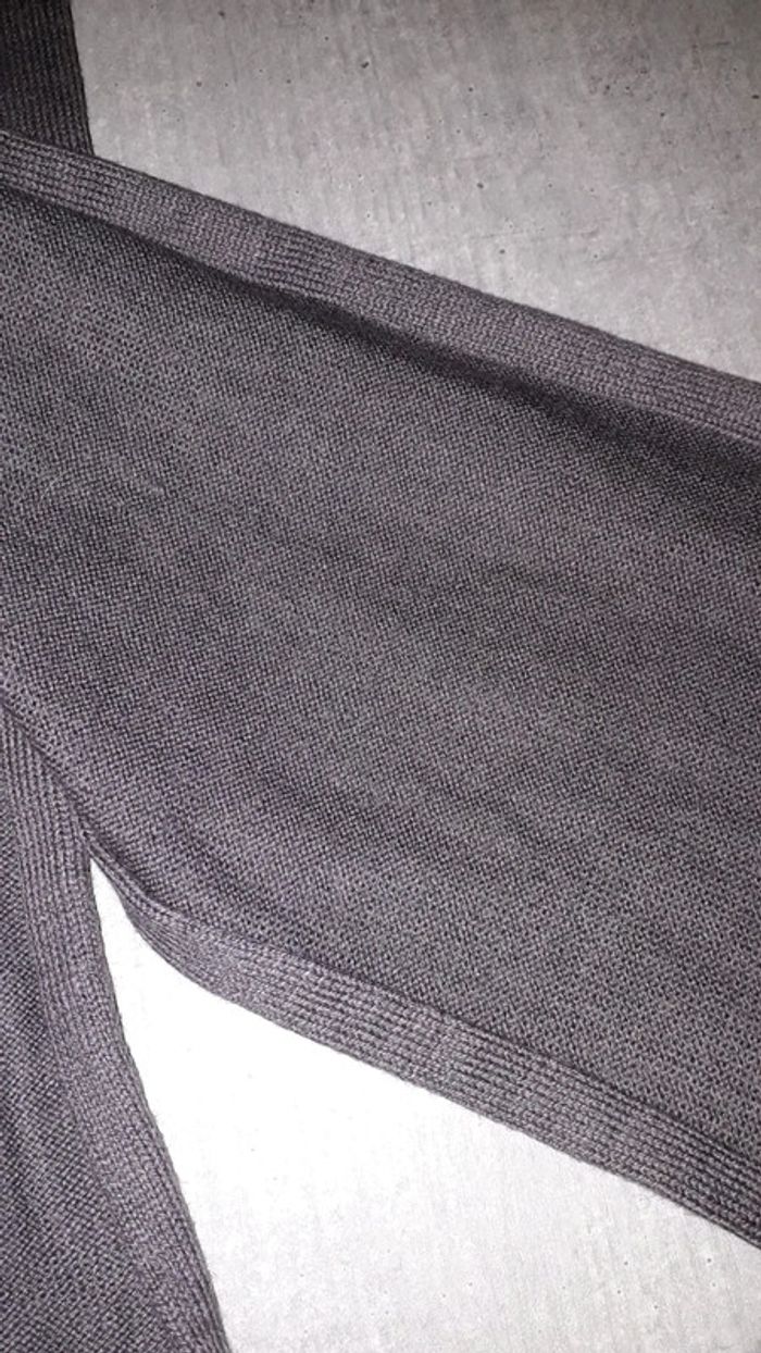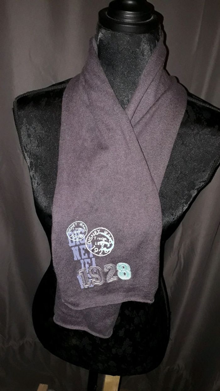 Écharpe pour garçon de couleur gris violine avec motifs bleu ciel, bleu marine et gris clair. Longueur 110 cm, largeur 20 cm. Les côtés s'enroulent légèrement (cf dernière photo).