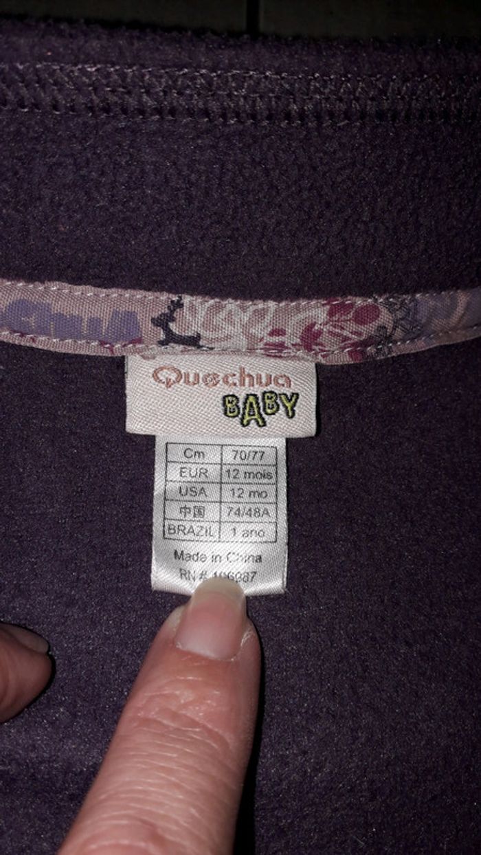 Gilet polaire violet de la marque Quechua Baby taille 12 mois. Présence d'une fermeture éclair.
