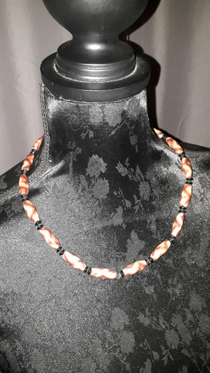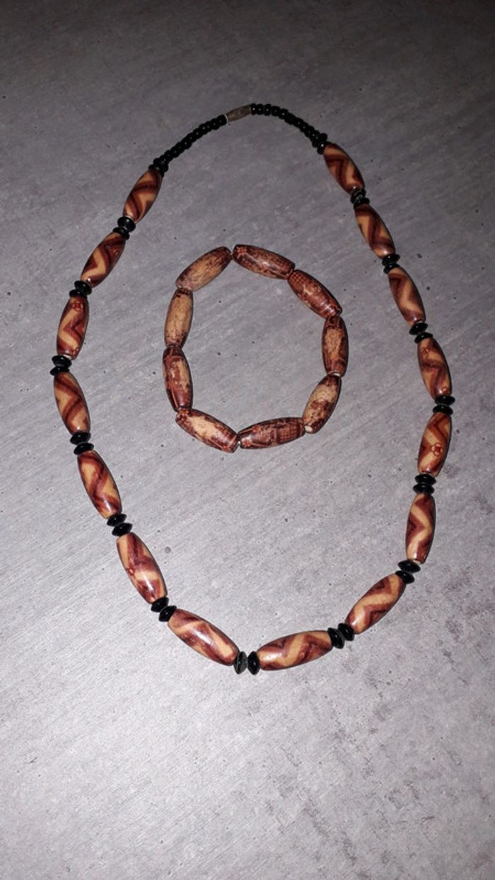 Parure : collier en perles noires et en bois, présence d'un fermoir + bracelet élastique en perles en bois.