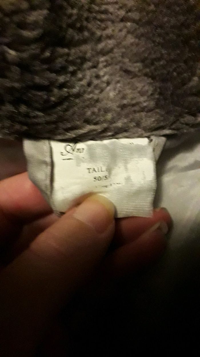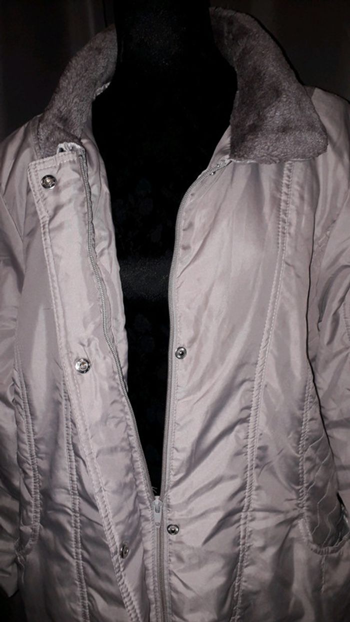 Manteau gris clair avec col gris anthracite taille 50/52. Fermeture eclair et boutons pressions. Présence de quelques tâches peu visibles (cf dernière photo).