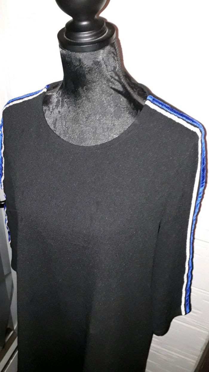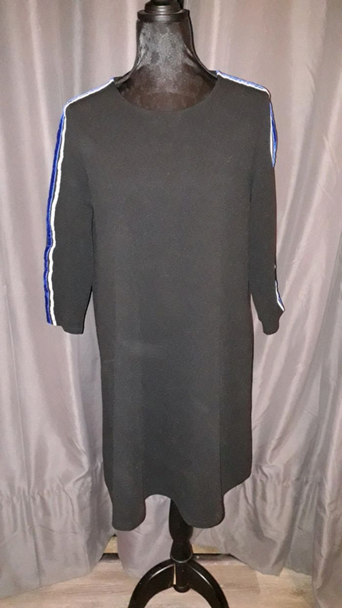 Robe noire avec des bandes sur les manches bleues et grises de la marque Pimkie taille 42.