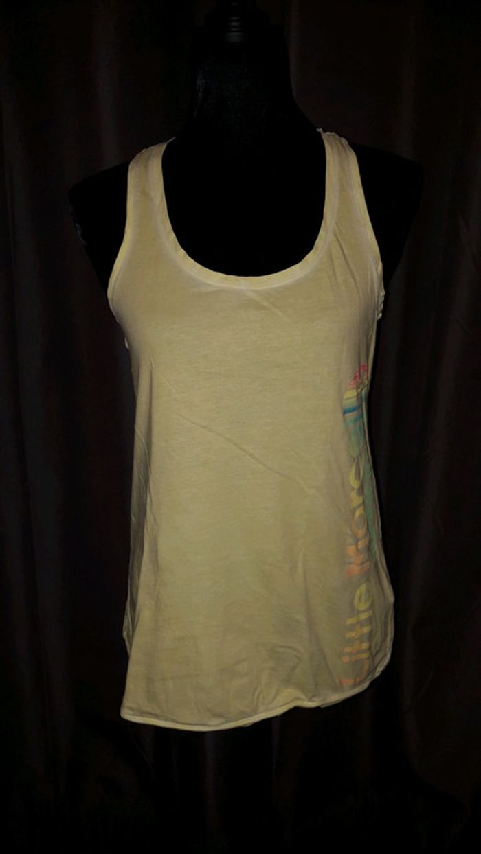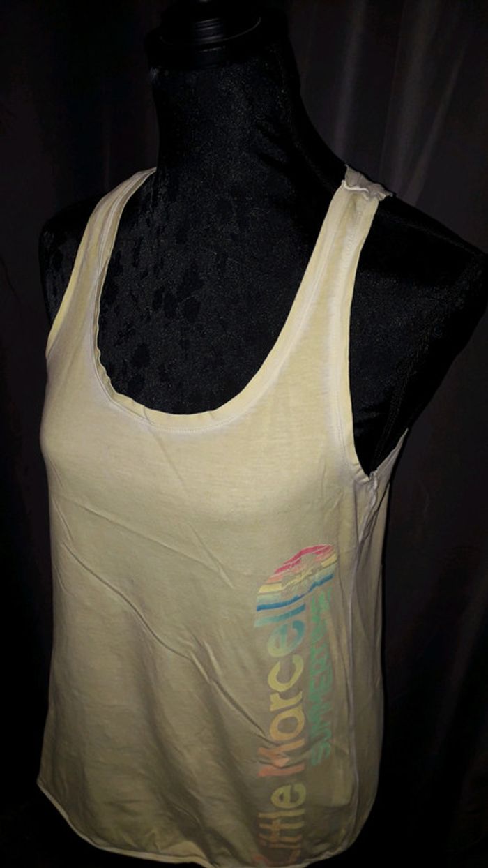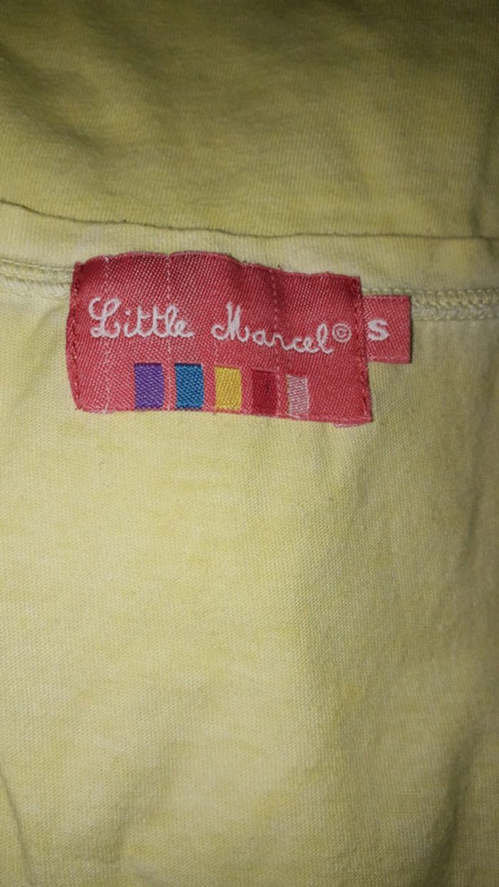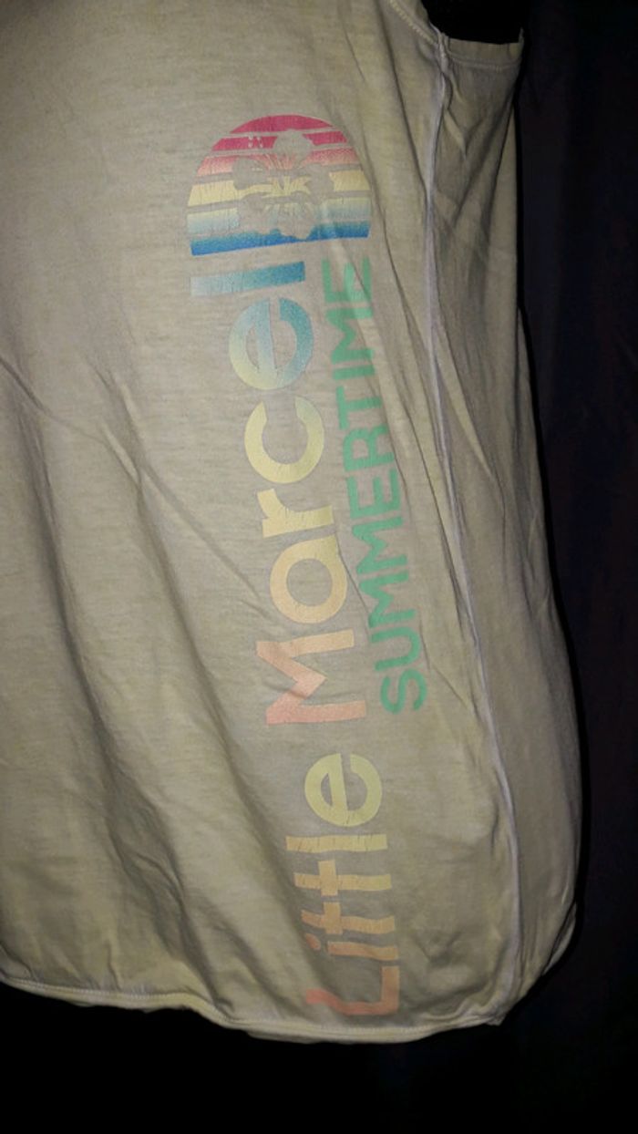 Débardeur long jaune effet délavé avec inscriptions multicolores de la marque Little Marcel taille S.