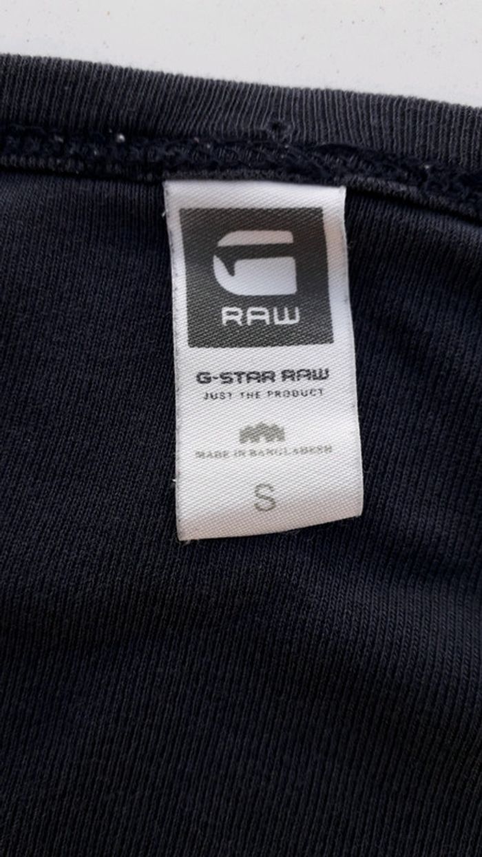 Tee-shirt manches courtes noir de la marque G Star taille S. Peu être un peu délavé mais les photos prises sur le mannequin sont prises au soleil ce qui fausse un peu la couleur, se fier davantage à la photo 2 pour la véritable couleur.