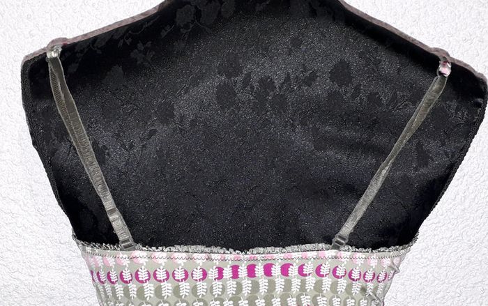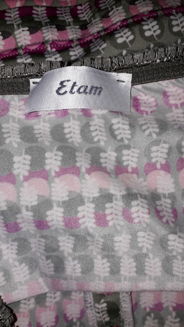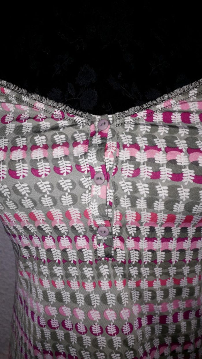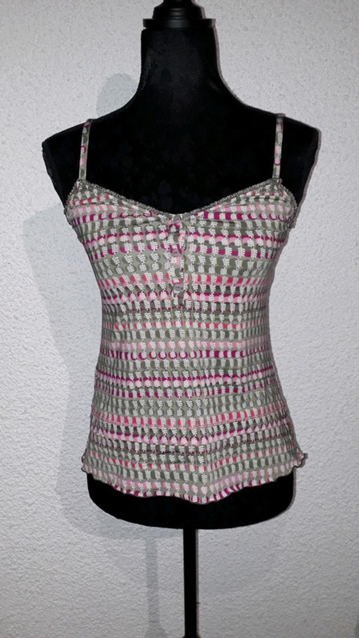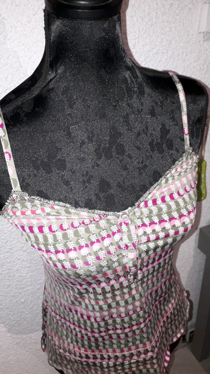 Très joli débardeur de nuit de la marque Etam. De couleur kaki, rose et rose fushia à motifs. Belles finitions sur les contours, boutonnière sur le devant, bretelles réglables dans le dos. Taille 38.