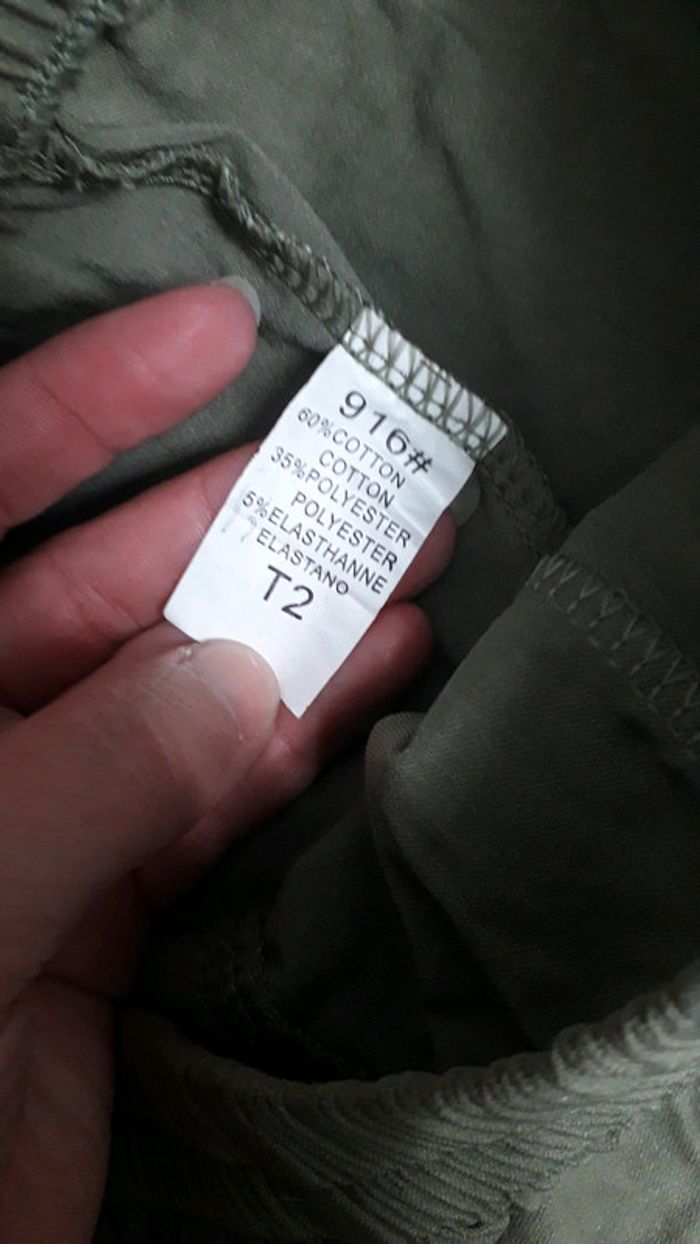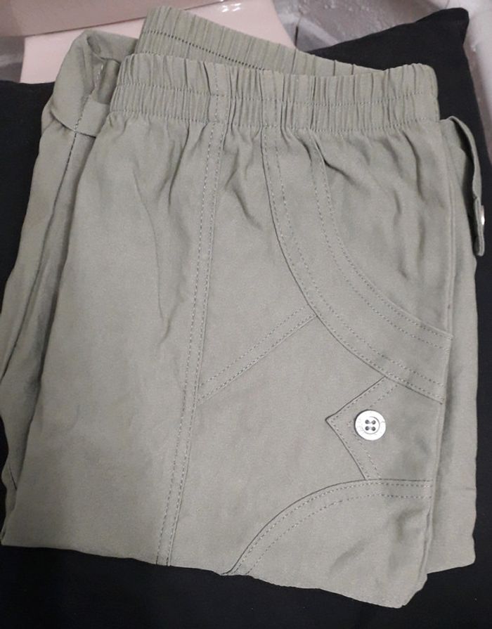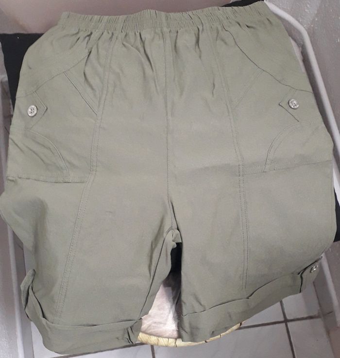 Short femme kaki avec poches et boutons de couleur argentée sur le devant, arrière sans poches et simple, revers sur le bas, taille 2, taille élastique.